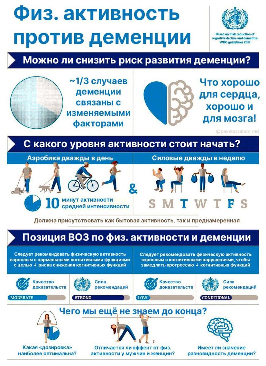 😊 с возрастом мозг становится уязвимее. когнитивные функции (память, внимание, скорость реакции) могут ухудшаться, а деменция - одно из самых тяжелых проявлений этого процесса. но исследования показывают, что мы можем влиять на этот процесс. 😊 в большом исследовании JAMA, в котором участвовали 4324 человека, было показано, что у тех, кто в 45–64 года вел активный образ жизни, риск развития деменции был на 41 % ниже, а у активных в 65–88 лет - на 45 % меньше, чем у людей с низкой физической активностью. 😘что важно понимать? активный образ жизни после 40 лет, регулярные умеренные и более интенсивные нагрузки - не «гарантия» предотвращения деменции, но одни из самых надежных профилактических мер. 😘более того, они могут замедлить прогрессирование уже существующих когнитивных нарушений. 😊 что это значит на практике? регулярные прогулки, бег, плавание, йога, силовые тренировки - все считается. эффект наступает при устойчивой активности. #докмед