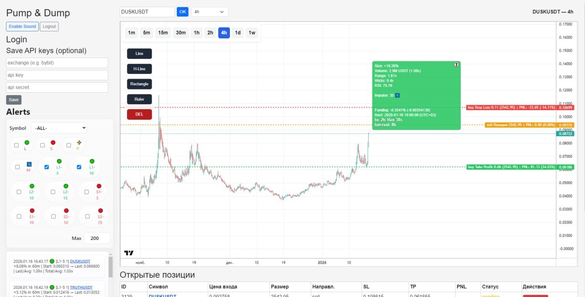 Контракт #DUSKUSDT — цена подходит к сильному уровню сопротивления, от которого можно ожидать мощный отскок (дамп). Потенциал нисходящего движения ~34%. Ордера можно выставить как в скриншоте, но саму позицию рекомендую переместить под цену после начала разворота на расстояние около 5-7%. Это позволит без рисков отработать сетап и собрать хороший профит. Сетап без усреднений. 🔸Параметры для воркера (терминал Pump & Dump): ▪️Breakeven: 6,2 ▪️Trailing: 3,3 ➖➖➖➖➖➖➖➖➖➖➖➖➖➖➖ 🤖 Автоматическая торговля: DCA Reversal Bot 🖥 Торговый терминал: Pump & Dump 🅱️ Биржа для торговли: Bybit 💬 Трейдерский чат ➖➖➖➖➖➖➖➖➖➖➖➖➖➖➖