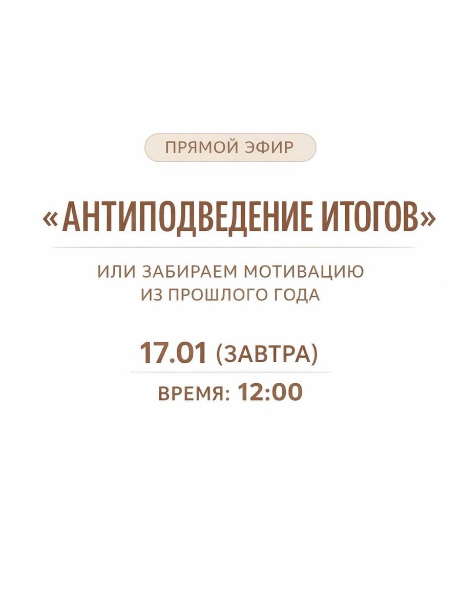 ? 🙃 Уже включились или еще раскачиваетесь?)) Завтра буду проводить прямой эфир для заряда мотивацией на 2026 год, приглашаю всех желающих 🙂 Поговорим про цели, которые не реализуются, и почему мотивация из года в год не «доезжает» до результата. Ссылка будет в отдельном чате, вступайте 👉🏼 https://t.me/+jc5H06oz3ythY2Y6 🤩 Прямой эфир - «Антиподведение итогов или забираем мотивацию из прошлого года» 🤩 Завтра (17.01) 🤩 12:00 🤩 Будет про: — причины, из-за которых планы остаются планами — как забирать энергию и мотивацию из прошлого года, а не обесценивать его 🤩Участникам бонус: ответы на вопросы + файл «Итоги года: личная перспектива» Ссылка на эфир придёт в назначенное время вот сюда Участие - бесплатное! До встречи завтра 🤩 И всем замечательного года! 🤞