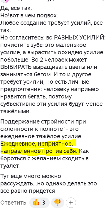 направленное против себя" -это мысль из коммента, которая требует особого внимания. А коммент такой: Любой человек может выбирать! И никто у него это право выбора не отбирает, и не может отобрать, ЕСЛИ... в которое мы сваливаемся, очень привычно сваливаемся, если в своей жизни привыкли многое (не только еды касается) делать против себя, привыкли отказываться от права выбора. И ведь только вчера я об этом написала ОЧЕНЬ подробную статью, которая вызвала бурную реакцию у читателей - 7 человек отписались от канала, прочиток всего 29. Люди не хотят это видеть, не хотят об этом знать, не хотят в этом признаваться даже самим себе. Но факт остается фактом: Ответ ведь простой: чтобы порадовать маму и папу, чтобы быть для них хорошим и таким образом получать чувства одобрения и безопасности. И трагедия такого подхода к самому себе значительно шире, чем лишний вес. Это предательство себя по всем направлениям жизни. Очень подробно разбирала в статье: - это переписка под статьей: Посм