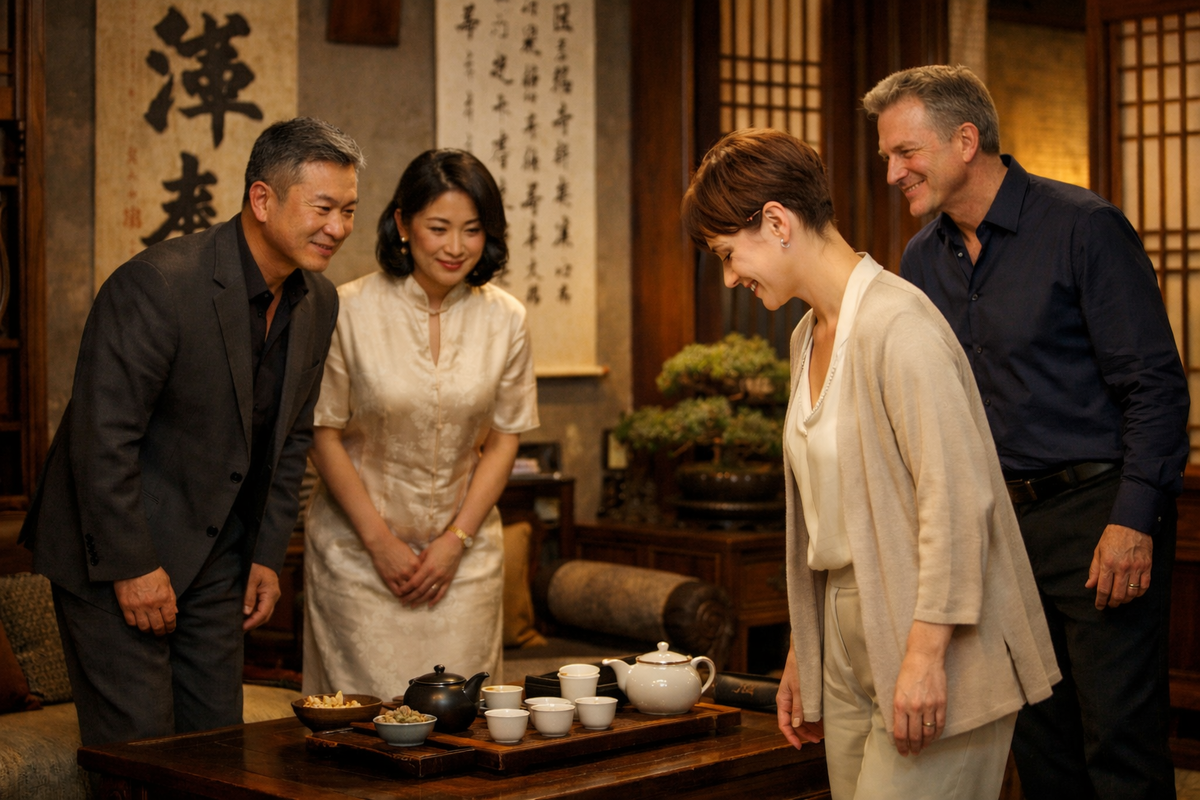 В малой гостиной, отделанной темным деревом и украшенной свитками с каллиграфией, царит уютная атмосфера. Супруги Чэн и Матвей сидят у низкого столика, на котором стоит изящный фарфоровый сервиз. Они неторопливо пьют чай. Увидев меня на пороге, все трое встают в знак приветствия – жест уважительный и старомодный. Я отвечаю лёгким поклоном головы и улыбкой, в которой и благодарность, и лёгкая неловкость гостя.