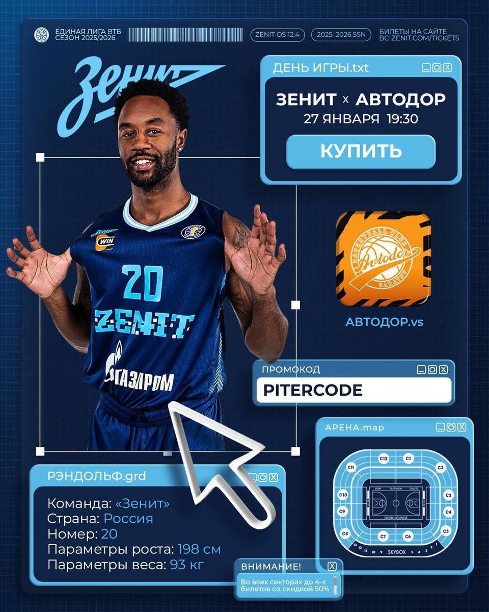 🏀 БК Зенит 🏀 🗓 На матчи с 27 января по 7 февраля 🎫 Билеты со скидкой 50% КСК «АРЕНА» 🏟 Баскетбольный Клуб Зенит спешит вас порадовать зимней распродажей! На матчи с 27 января по 7 февраля действует скидка 50% во всех секторах! Ребятам нужна вся поддержка и эмоции, без вас никак, нужно выручать сине-бело-голубых) Расписание всех матчей: 27 января в 19.30 🏀ЗЕНИТ vs АВТОДОР 🏀 1 февраля в 13.00 🏀ЗЕНИТ vs САМАРА 🏀 4 февраля в 20.00 🏀ЗЕНИТ vs ЕНИСЕЙ🏀 7 февраля в 13.30 🏀ЗЕНИТ vs МБА-МАИ🏀 Промокод: PITERCODE 🚨Данная скидка действительна на билеты в секторах 1, 2, 3, 4, 5, 6, 7, 8, 9, 10, 11, 12 🚨 до 4 билетов на один аккаунт 🚨 покупать билеты тут 🚨 поддержать канал‼️ 🚨не забудь подписаться на Дзен и на ТГ