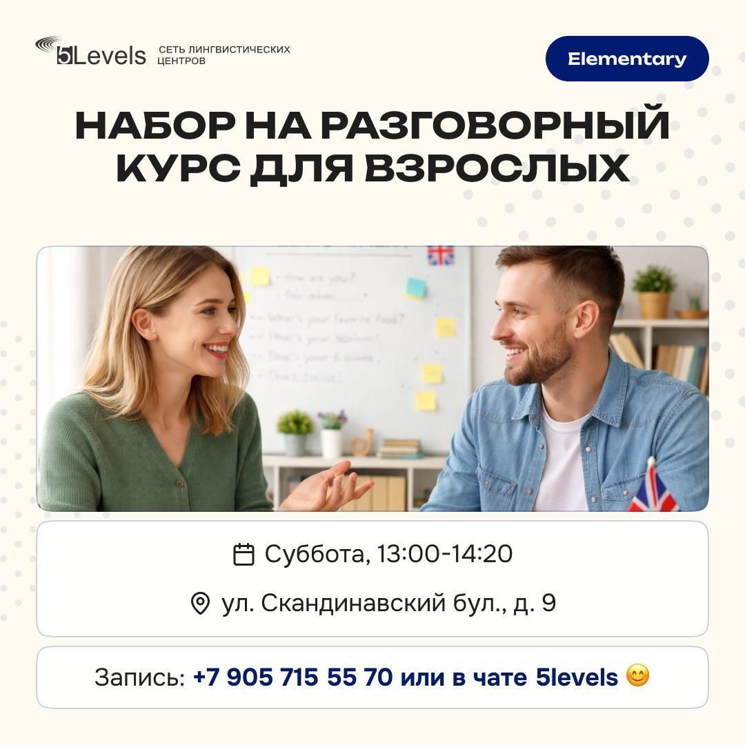 Ищете, где начать говорить по-английски уверенно и без скуки? Приходите на наш курс — мы учим говорить, а не зубрить 😉 Что ждёт на занятиях: 🔘 много разговорной практики — общение в парах и группах, 🔘 интересные темы и живые дискуссии, 🔘 «нескучная» грамматика — объясняем правила кратко и применяем сразу в речи, 🔘 видео, игры, ролевые задания и другие форматы, которые помогают говорить свободнее. 🕒 Расписание: суббота, 13:00-14:20 📍 Адрес: Скандинавский бульвар, д.9 📲 Запись: +79057155570 или в чате 5Levels.