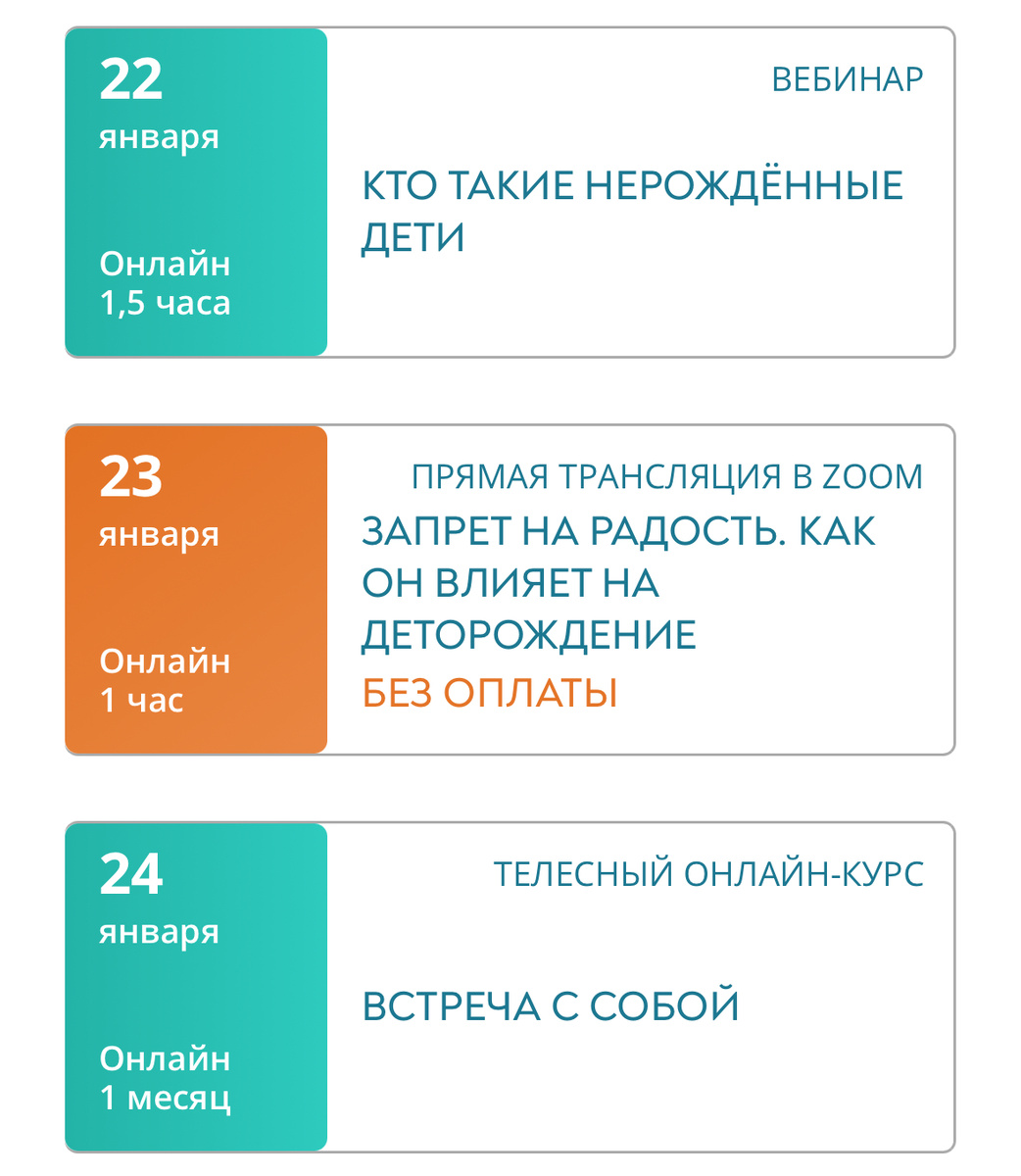 Мы с моей дружной командой очень стараемся для вас! Мы с большой любовью подходим к своей работе и очень благодарны вам за то, что доверяете нам самое дорогое - своё внимание. Если вы недавно присоединились к нам, то можете начать с любого недорогого или бесплатного вебинара или трансляции (оранжевый цвет). В нашем расписании всегда есть один из базовых курсов Наталии Мурашовой, курс и мероприятия к нему помечены синим цветом. «Кто такие нерождённые дети?» Что происходит с душами нерождённых деток и как пережить их потерю? Стоимость 200 руб. «Запрет на радость. Как он влияет на деторождение» Что такое запрет на радость, как он формируется с детства и как влияет на возможность иметь детей. Встреча с Мариной Лесковой «Встреча с собой» Почувствуй, как хорошо тебе в своём теле! Соединение с телом, возвращение чувствительности, снятие блоков, навыки телесной радости. Ведущая: Марина Лескова «Зачем я болею» Почему болеть всегда выгодно? Как увидеть скрытые выгоды своих болезней и начать пут