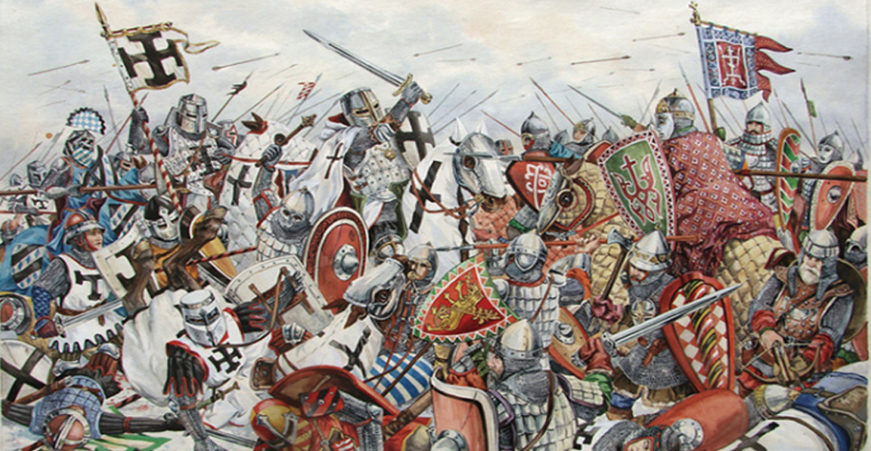 - Прорыв «свиньи»: Рыцари Ливонского ордена атаковали, выстроившись в мощный клин, который на Руси называли «свиньёй». Им удалось прорвать строй русского центрального полка.