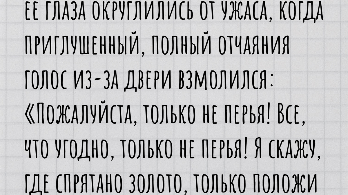 Маргарита Степановна приникла к замочной скважине, ее глаза округлились от ужаса, когда приглушенный, полный отчаяния голос из-за двери взмолился: «Пожалуйста, только не перья! Все, что угодно, только не перья! Я скажу, где спрятано золото, только положи на место этот...»