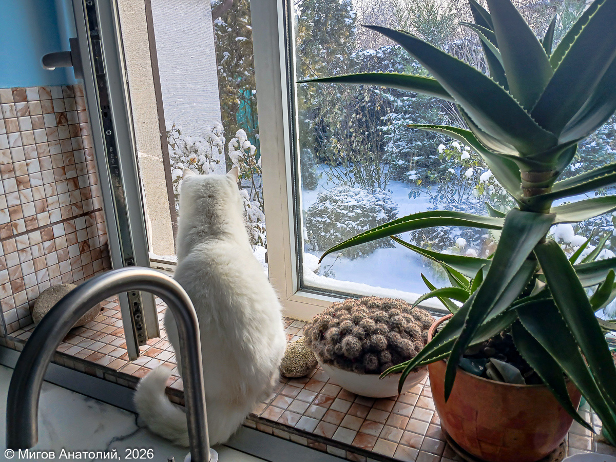 Кошка Маруся сидит на подоконнике, смотрит на улицу, а выйти не решается. Холодно в Старом Крыму. В 9 утра было -10, для теплого Крыма это перебор. За десять лет крымской жизни я совсем отвык от морозов. Для меня сейчас ниже минус пяти - это уже холодно. А нам такую погодку обещают на ближайшие десять дней. Вот-вот придет Крещение, кто-то будет окунаться в море. Бррр, как представлю, самого пробирает. Ближайшие от нас организованные крещенские купания проходят в Феодосии и Орджоникидзе. Мы с Леной ездили туда пару раз. Болельщиков собирается больше, чем купальщиков. Но и отважные люди, не страшащиеся зимнего моря, тоже есть. Маруся долго сидела, у открытого окна, но так и не решилась выйти. Наверное, так на неё повлиял пример кошки Кокошки. Та, не разобравшись в погодных условиях, утром весело выскочила в сад, но скоро вернувшись, обнаружила, что входа нет. Сидела там несчастная и запорошенная снегом, пока я не пришёл на кухню, чтобы поставить чайник, глянул в окно и спас ребёнка от о