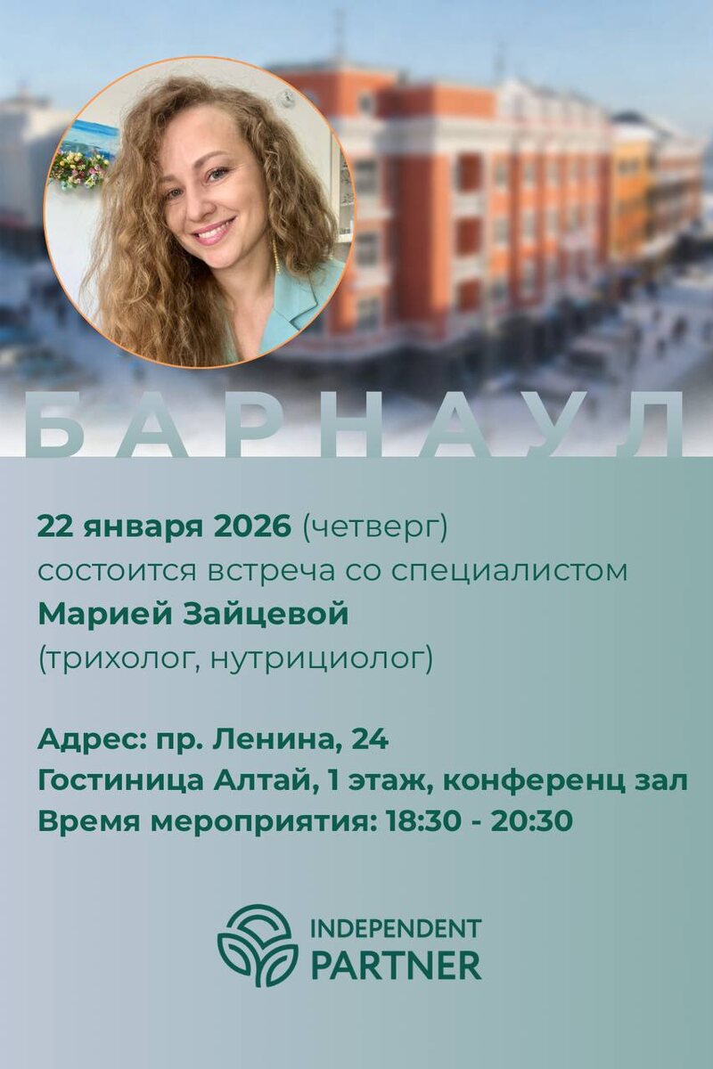 Барнауле «О ЧЁМ РАССКАЖУТ ВОЛОСЫ И КОЖА ГОЛОВЫ» Эксперт вечера - Мария Зайцева - член ассоциации, союза трихологов и русского общества исследования волос, опытный трихолог и нутрициолог с более чем 10-летним стажем, г.Москва. ❓Что Вас ждёт на ЭКСПЕРТНОМ ВЕЧЕРЕ: ✅ Мария расскажет, о причинах выпадения и секретах быстрого роста волос ✅Как устроена кожа головы, какие проблемы там могу скрываться и как их проработать через питание образ жизни и состояние жкт. ✅ На трихоскопе Мария покажет, как это наглядно на практике может быть видно ✅ Мария даст стратегии поддержки травами и БАД 450 руб - стоимость ☝🏻Запись – в личные сообщения, количество мест ограничено.