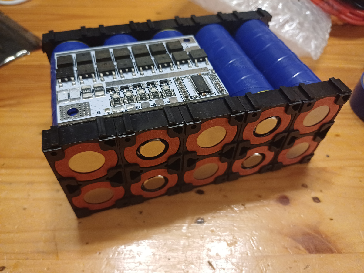 На этой фотографии я его заряжаю. Провожу тест: плата отрабатывает штатно и вовремя отключает аккумулятор. На КЗ (короткое замыкание) не проверял — честно скажу, страшно. Батарея может выдать до 1 киловатта мощности, а транзисторы на плате неоригинальные. Ячейки свежие, внутреннее сопротивление низкое — около 13 мОм.