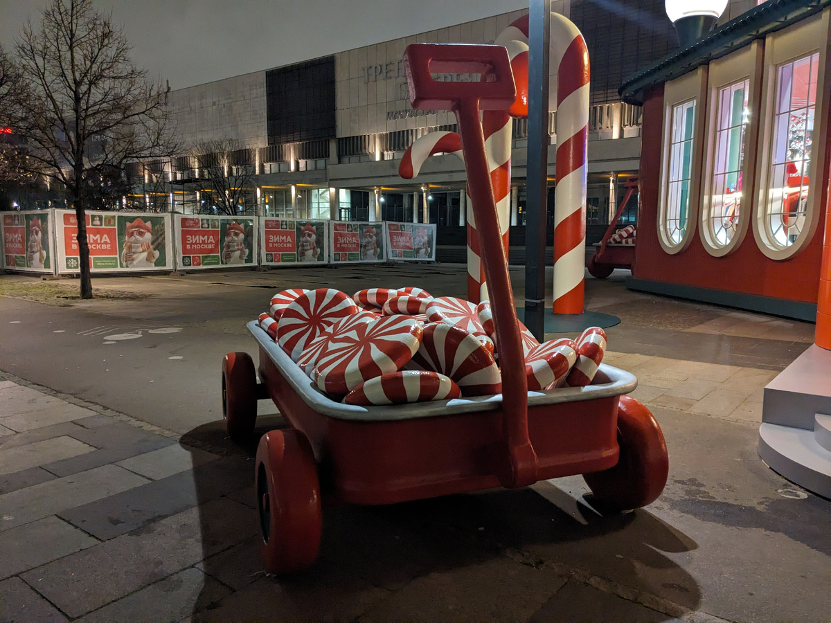 Признайтесь, вам ведь тоже захотелось спереть конфету из тележки на первом фото? (Если чё, они не приклеены. Свободно вынимаются) Думаю, дизайнерам московских новых годов, с одной стороны, есть где развернуться, с другой - очень непросто. Ведь кто-то когда-то решил, что ни один московский новый год не должен быть похожим на предыдущие. Думаю, это очень давно уже так, но в последние несколько лет прямо особенно чувствуется. И надо отдать должное: новые годы действительно разительно отличаются один от другого. Неизменно только одно: дебильные арки на Тверской и в некоторых других местах. Вероятно, это следствие персональной любви к аркам какого-то большого начальника. Примерно как кукуруза для Хрущёва. Иначе объяснить их живучесть невозможно.