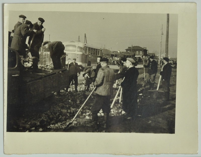 Фото. Перекресток улиц Зорге и К. Мяготина (возле магазина "Буревестник"). Субботник по благоустройству. | 1949 г.