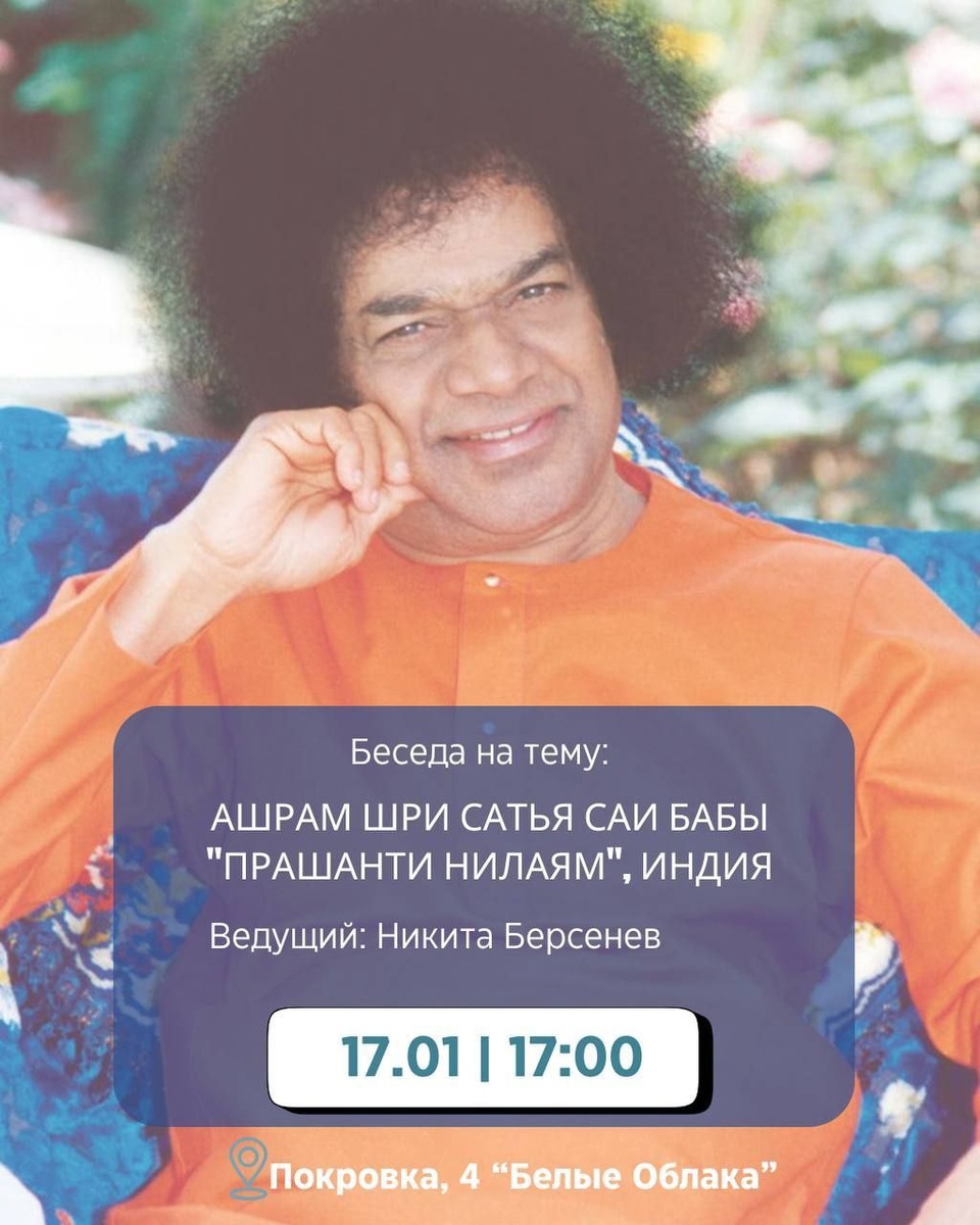 На встрече мы поговорим об Ашраме Шри Сатья Саи Бабы, как туда попасть, как там жить и чем в этом Ашраме можно заняться, а также обсудим ваши вопросы.