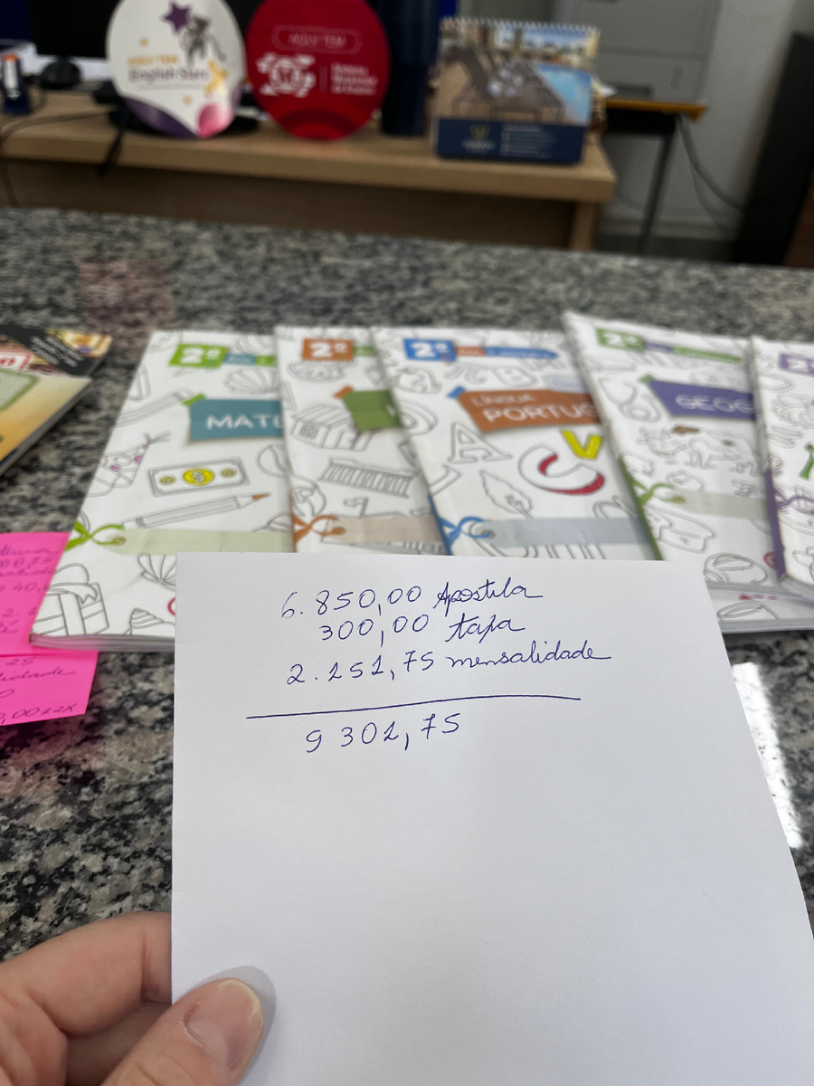 Сходила в школу, оформила документы детям еще на год (в частных школах контракт заключается ежегодно). Оплатила первый месяц обучения, учебники и административный взнос. Получилось 9300 тысяч реалов в сумме.