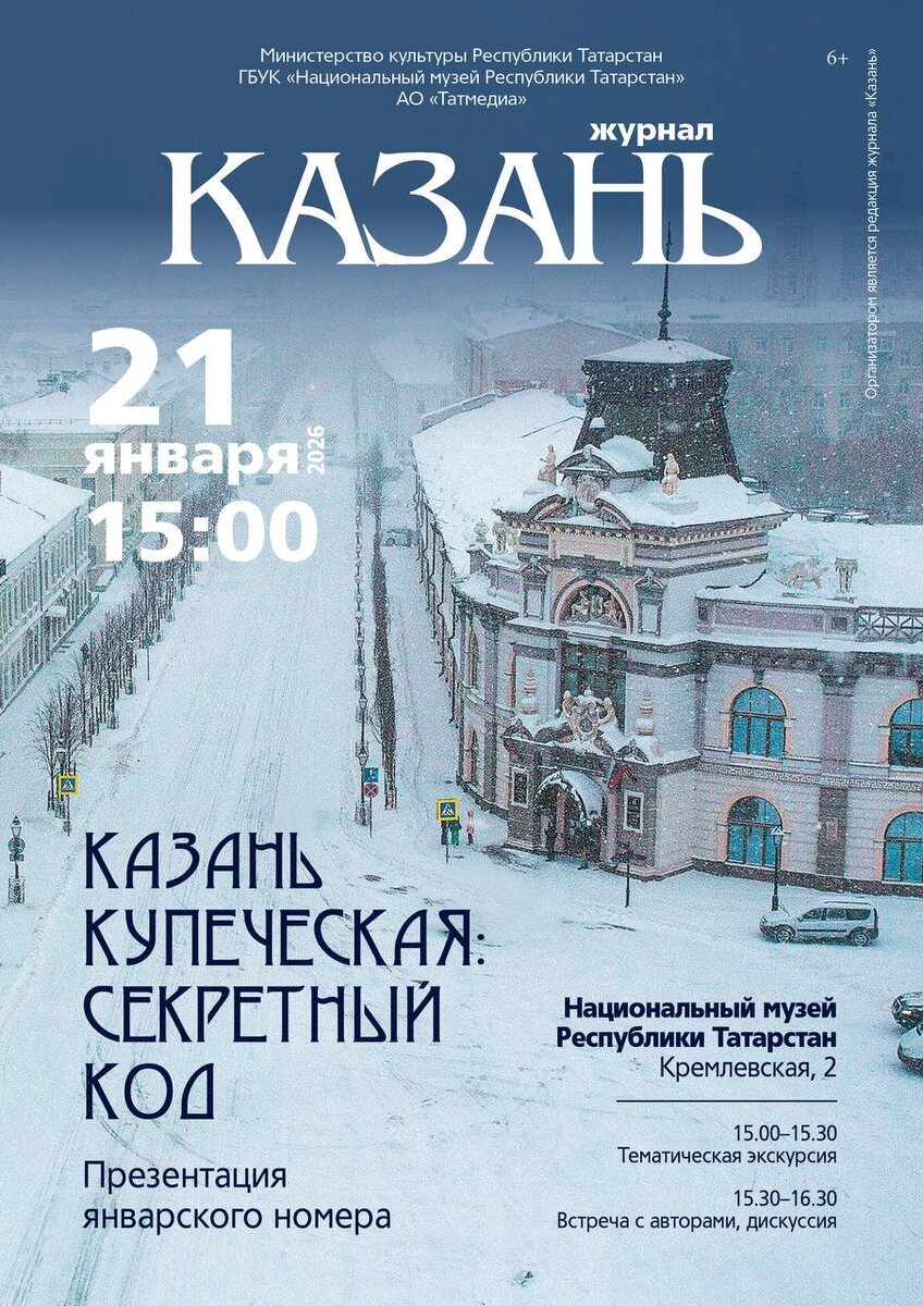 » Для гостей подготовлена театрализованная экскурсия, в ходе которой можно будет увидеть музейные предметы, экспонаты и редкие артефакты, рассказывающие о казанском и татарстанском купечестве. Во время встречи с авторами номера журнала участник мероприятия смогут задать вопросы и узнать больше о подготовке номера, посвященного истории купечества и торговой и общественной жизни Казани. 📆21 января, вход свободный 📍Начало в 15:00 🏛Национальный музей РТ