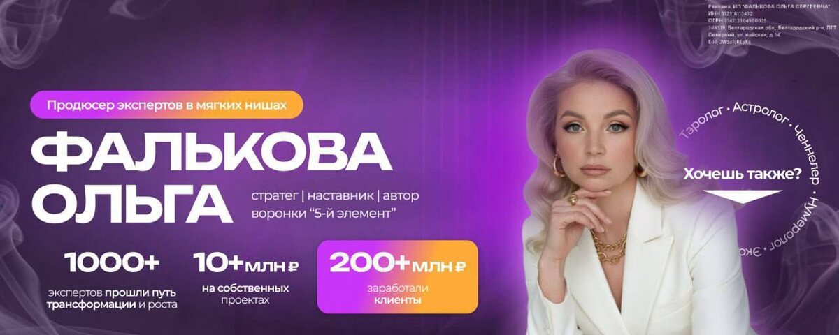 Пора это изменить.🔮 Привет! Наверняка ты смотришь «Битву экстрасенсов» и думаешь: «У меня тоже есть дар или знания. Почему я помогаю людям, а мой доход не растет?» Знакомо? Клиенты есть, но они «энергетически сложные». Работаешь «впустую», а твои уникальные методики так и остаются твоим секретом. Пора выйти из тени.🔛 Меня зовут Ольга💅. Я не медиум и не гадалка. Я — специалист, который помогает экспертам в нумерологии, экстрасенсорике и психологии превратить дар или знания в стабильный высокий доход.💸 Не через «волшебную таблетку», а через четкую систему Что будет, если продолжить как есть? Усталость, выгорание и ощущение, что твой дар не ценят. Что будет, если действовать? Ты начнешь притягивать «своих» клиентов, повысишь чек в 2-3 раза и создашь личный бренд, который работает на тебя 24/7. Это не для всех. Это для практикующих нумерологов, экстрасенсов, тарологов, психологов, которые устали быть «дешевым предсказателем» и готовы стать уважаемым, высокооплачиваемым эксперто