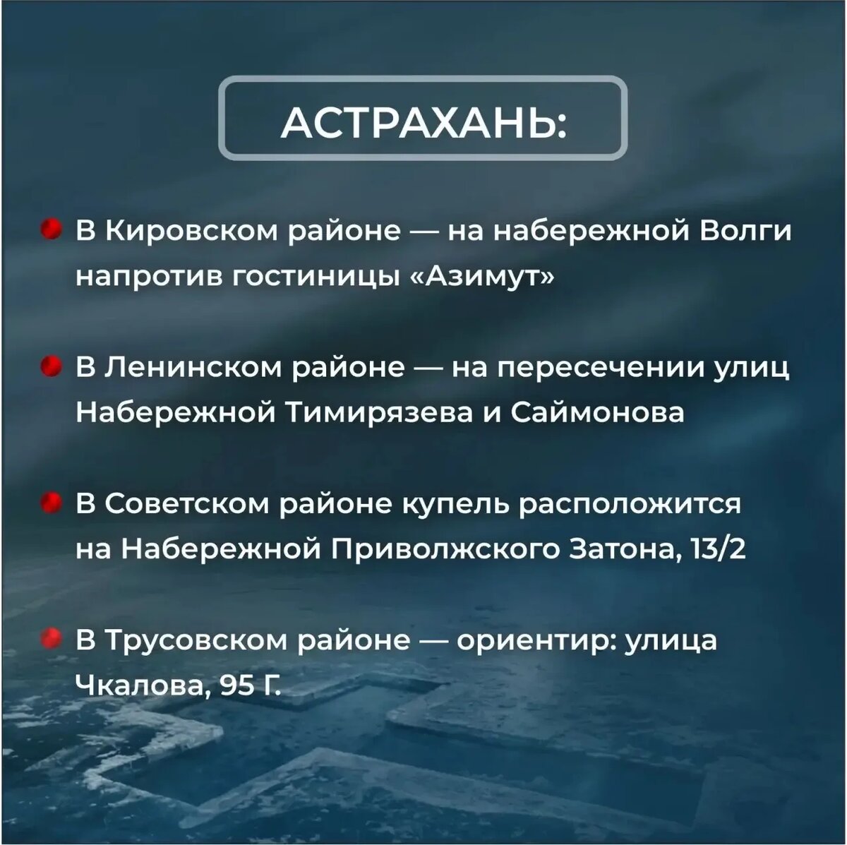 Приближается один из самых светлых православных праздников – Крещение Господне. Губернатор Игорь Бабушкин обратился к астраханцам с призывом быть внимательными и осторожными, окунаться только в специально оборудованных местах, там будут нести дежурство медики, спасатели, полиция и добровольцы. «В этом году погода соответствует духу зимнего торжества: снег и мороз пришел в регион. По традиции, в большинстве муниципалитетов будут оборудованы купели», — подчеркнул глава региона. В Астрахани определены четыре места купания. Окунуться в прорубь там можно будет до 22:00 19 января. Для безопасности и комфорта астраханцев на берегу поставят палатки для обогрева, переодевания, а также развернут пункты с горячим чаем.
