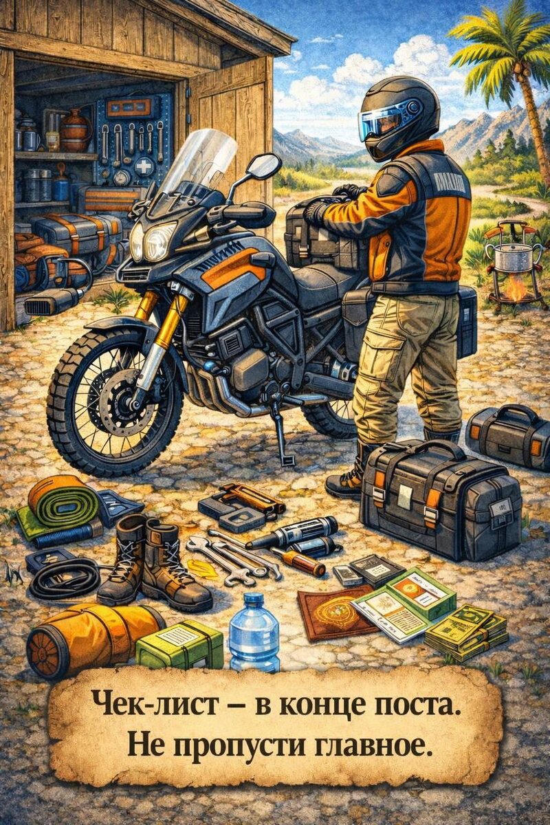 … Первый раз едете на мотоцикле дальше, чем до работы? Набрали вещей, сложили в чемодан — а теперь думаете: «Как его закрепить на байке?» Правильно — никак 😅 На мотоцикле есть кофр. Но он в 3 раза меньше чемодана, а вещей от этого не убавляется. И начинаются муки выбора: взять вторую футболку или пассатижи? Да, мотопутешествие — это минимализм. Боковые кофры, седельная сумка (если без пассажира) — и всё равно места не хватает. И это не недостаток, а философия: заставляет думать. А ведь в дороге мотоцикл может потребовать ухода, а то и ремонта. Поэтому в кофр обязательно: – Минимальный набор инструментов (ключи, отвёртки, пассатижи — они решают 80% проблем), – Моток изоленты (цвет неважен, но легенда гласит: синяя — самая надёжная 😉), – Ремкомплект для шин: шило, жгут, клей. Запаски нет, а до шиномонтажа — 150 км… Цепь тоже требует внимания. Если пробег больше 500–700 км или прогноз обещает дождь — без очистки и смазки не обойтись. А если нет центральной подножки? Тогда л