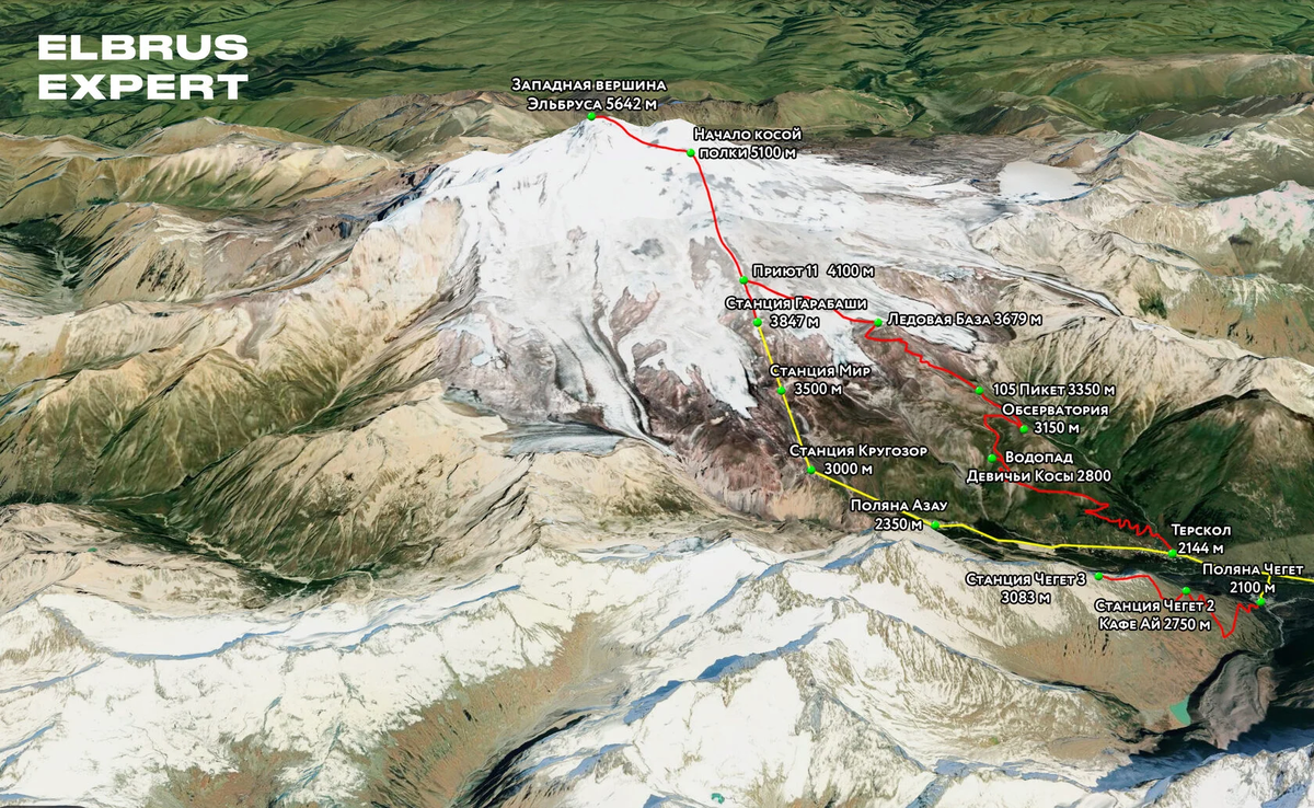Это проверенный традиционный путь восхождения, который используется на протяжении многих лет и подходит для восходителей с базовой подготовкой. ☝🏻 Разумеется, подготовка зависит от вершины: по классическому маршруту на Эверест новичкам подниматься не рекомендуем :) Такие маршруты проходят через основные, хорошо изученные участки и не требуют использования специального снаряжения, такого как ратраки или вертолёты. Они предлагают относительно доступный путь для восхождения, но всё равно требуют хорошей физической подготовки и навыков работы с альпинистским снаряжением. Например, классический маршрут на Эльбрус с юга — он выделен красным на карте. Можно рассмотреть внимательно. Что это значит для вас? • низкая техническая сложность, всем необходимым навыкам учат профессиональные инструкторы прямо на маршруте • всю гору пешком с палатками и рюкзаками — самый настоящий альпинизм, доступный для новичков • идем вдалеке от инфраструктуры, отдыхаем от цивилизации • восхождение на высшую точку