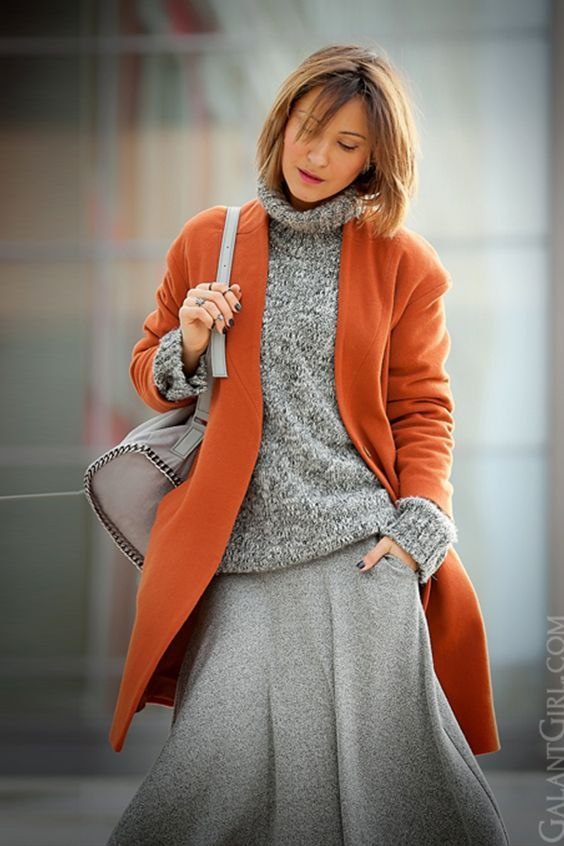 Начнем с сочетания, которое считается вершиной элегантности. Представьте: сочное оранжевое пальто или жакет поверх спокойного, меланжевого серого джемпера.