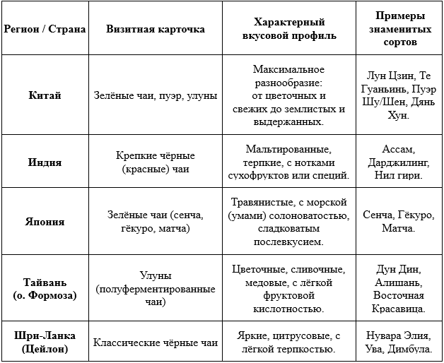 Когда вы покупаете чай онлайн, название сорта часто звучит как магическое заклинание. Но за каждым именем скрывается уникальный вкус, рождённый в конкретном уголке планеты. Понимание чайной географии — ключ к осознанному выбору. Давайте отправимся в виртуальное путешествие по главным регионам, где рождается ваш будущий любимый напиток. В мире более 30 стран-производителей чая, но лидеры по качеству и разнообразию сформировали узнаваемые стили. Китай — не просто родина чая, а целая вселенная со своими «терруарами». Здесь выделяют четыре великих чайных региона, каждый со своей специализацией: Вот краткий гид, который поможет вам «перевести» ваши вкусовые предпочтения на язык чайных регионов и сортов: Ваше чайное путешествие начинается здесь! Сохраните эту шпаргалку, чтобы в следующий раз уверенно выбрать чай в онлайн-магазине. А лучше — начните с набора-дегустации, чтобы на практике сравнить вкусы Дарджилинга, Ассама и тайваньского улуна. Поделитесь в комментариях, вкус какого региона из