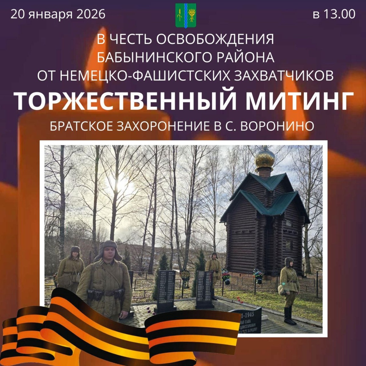 Дорогие друзья! Приглашаем вас на торжественный митинг, посвященный 84-й годовщине освобождения Бабынинского района от немецко-фашистских захватчиков.