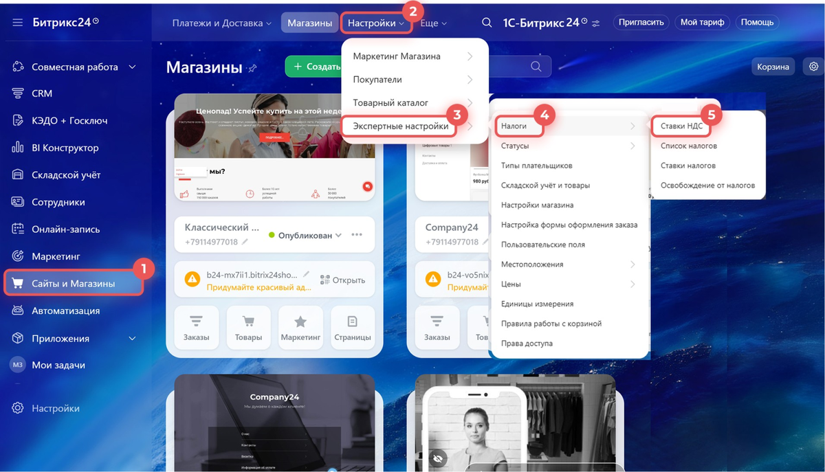 - Откройте настройки налогов. Варианта два – через раздел Сайты и магазины (подраздел Настройки → Экспертные настройки → Налоги → Ставки НДС) или через раздел CRM (меню Еще → Настройки CRM → Налоги). Оба пути ведут к одному и тому же списку ставок, используемых во всех разделах.