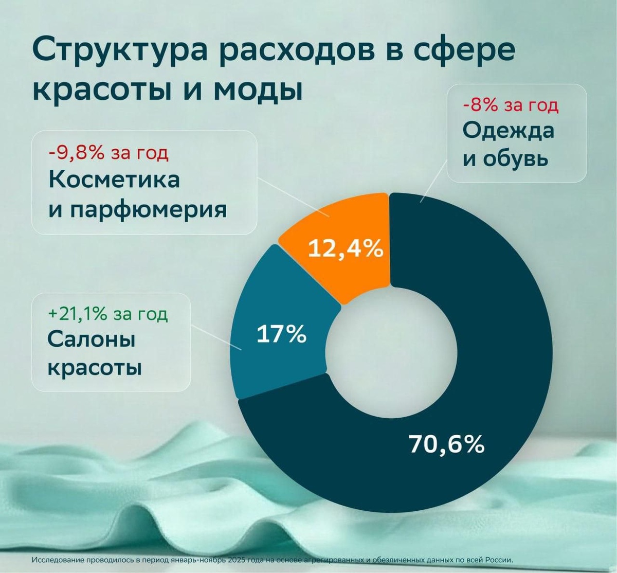 ? По данным "СберАналитики", мы стали тратить в магазинах этих категорий почти на 10% меньше (за январь-ноябрь 2025). Но при этом средний чек там подпрыгнул аж на 27% (до 1383 руб.). Зато салоны красоты впереди планеты всей - объём трат там вырос на 21%. Почему так? Всё просто - заказать платье или новую помаду можно и на маркетплейсе, но вы когда-нибудь пробовали заказать с доставкой в ПВЗ какое-нибудь "сложное окрашивание волос"? Услуги - это то, что всё еще требует нашего личного присутствия и живых рук мастера. При этом новые шмотки всё еще забирают более 70% всех расходов в категории "мода и красота", но офлайн-точки теряют обороты (-8%), на втором месте салоны красоты (17% от всех трат), ещё 12,4% всех денег оставляют в магазинах парфюмерии и косметики. Ну и про возраст. Аудитория от 35 до 54 лет обеспечивают 61,5% всех расходов у "моды и красоты". При этом бьюти салоны - самые "молодые" (доля покупателей 18-34 лет здесь составляет 28,2%). И само собой, женщины формируют бол