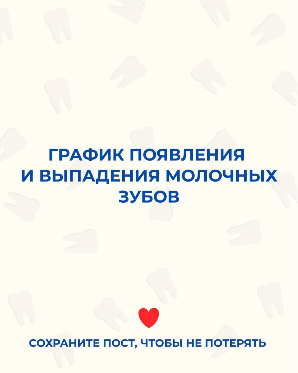 🦷 Мы подготовили для вас удобный гид по графику появления и смены молочных зубов. Сохраняйте в закладки, чтобы не терять! 🚩 А в каком возрасте у вашего малыша появился первый зуб? Пишите в комментариях! 👇 У нас в стоматологии есть адаптационный прием 🙌🏻 Как он проходит? • Знакомство с кабинетом и доктором, • игра с зеркальцем и креслом, • объяснение, что и зачем делает врач, • лёгкий осмотр зубов, дёсен, прикуса. После таких приемов, дети успокаиваются, понимают, что врач-стоматолог - это не страшно и легко идут на контакт 🩵
