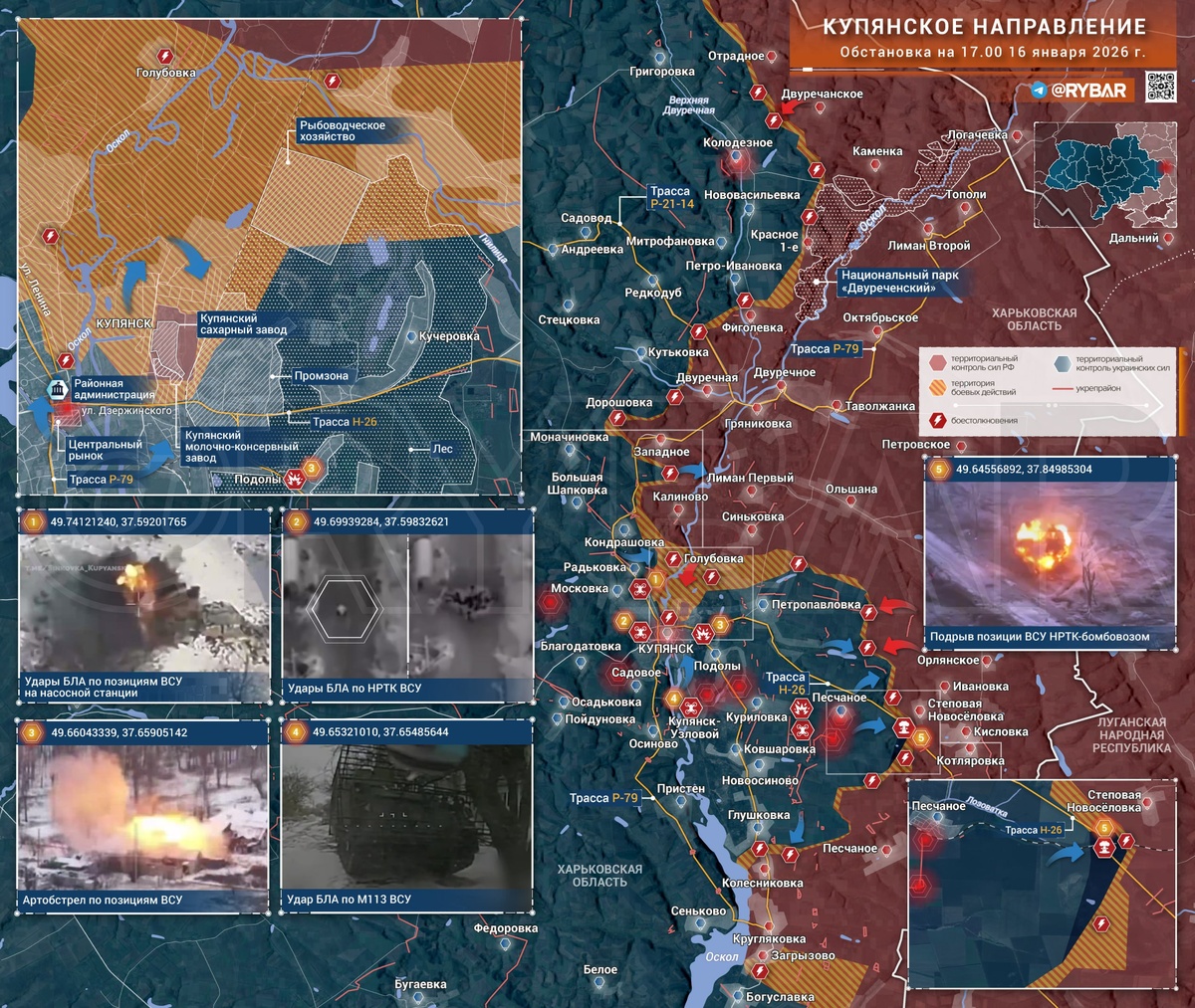 📝 Обстановка остается крайне сложной. Противник продолжает перебрасывать подразделения в город, наращивая силы. На плацдарме идут ожесточенные столкновения, украинская техника систематически уничтожается в ходе атак на переправы. ▪️По данным из открытых источников, украинские формирования удерживают позиции севернее Купянска, а также в самом городе и Купянске-Узловом. ▪️Российские подразделения ведут оборонительные бои на северных и северо-восточных окраинах города. В центральной части наблюдается рост концентрации сил противника, судя по появлению антенн связи. ▪️Российская артиллерия продолжает наносить удары по позициям противника, в частности, по окрестностям Подолов. Однако, информация о точном времени съемки видео, опубликованного 14 января, вызывает вопросы - по нашей информации, съемка велась около недели назад. ▪️Успехи операторов БЛА отмечаются в окрестностях Степовой Новоселовки, где был уничтожен пункт управления БЛА противника. 📌Бои продолжаются с высокой интенсивн