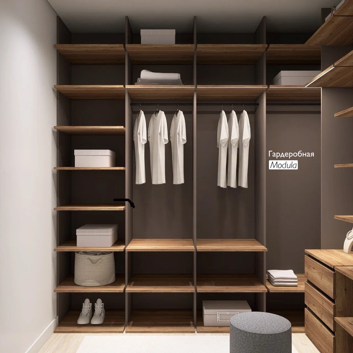 Гардеробная Modula — система индивидуального хранения✨ Гардеробная Modula создана для тех, кто ценит рациональный подход к организации пространства. Конструкция основана на принципе модульности: каждый элемент можно подобрать под конкретные задачи и параметры помещения. Это позволяет проектировать систему хранения любой конфигурации — прямой, угловой или П-образной — с учётом особенностей планировки и образа жизни владельца. 💡Функциональность Modula заключается в возможности точной настройки наполнения. Секции различной ширины и высоты дополняются выдвижными ящиками, пантографами, брючницами, корзинами и зеркальными панелями. Для большего комфорта предусмотрена интеграция подсветки. Сбалансированные пропорции, лаконичные линии и универсальные отделки делают систему уместной в интерьерах разных стилей — от минимализма до современной классики. Modula объединяет эргономику и архитектурную чёткость, создавая продуманное пространство для хранения, где каждая деталь имеет функциональное