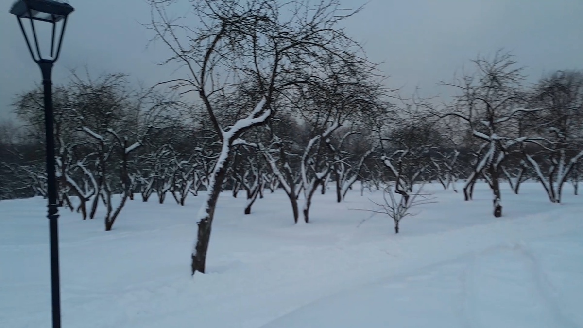 В будний день людей не много. Прогулялась по Дьяковскому яблоневому саду. Тишина, деревья спят. Пруд замёрз и весь под снегом.