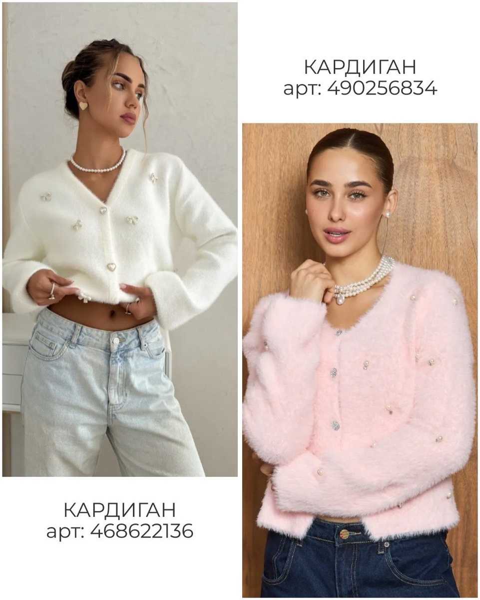 Пушистое полотно всегда воспринимается как более «богатое», чем гладкий трикотаж, потому что оно создаёт мягкую тень и эффект воздушности. Важно, что пушистость здесь ровная: вещь выглядит ухоженно, а не «растрёпанно». Камни — маленькие световые точки, которые играют при движении и делают кардиган наряднее без лишнего пафоса.