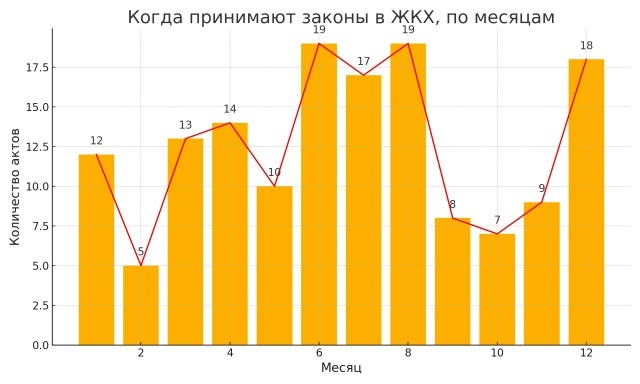 Составил я хронологию основных законов по ЖКХ с 1917 года и до 2025. Разобрал даты по месяцам. И получился вот такой график. Здесь показано, сколько актов по ЖКХ (основных, не вообще всех, конечно) принято в месяце. Это за более чем 100 лет. Вот что странно. ЖКХ почему-то достается особенно летом и перед Новым Годом. Именно летом любят принимать законы, приказы, постановления и прочее, что влияет на ЖКХ. Почему так? Сказать сложно. Можно только пошутить (или нет?), что вопросы ЖКХ оставляют всегда на "последний день". Летом перед отпусками и зимой перед новогодними каникулами быстренько утверждают всякое про ЖКХ, и отдыхать. Какие у вас теории на этот счет? А еще я так увлекся этой темой, что написал целую книгу "История ЖКХ в России". Кстати, неожиданно оказалось, что она пользуется большим успехом прямо со дня публикации. То есть не мне одному такая историческая статистика оказалась интересна. Спасибо всем, кто проявил внимание к книге! А те, кто еще с ней не знаком, могут сейчас это