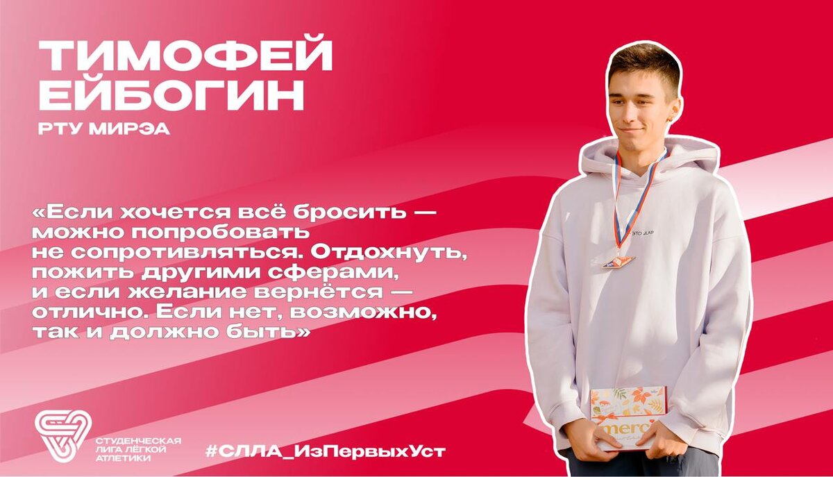 Тимофей Ейбогин — студент РТУ МИРЭА, кандидат в мастера спорта по спортивному ориентированию, член сборной Москвы, имеет 1 взрослый разряд по легкой атлетике.
