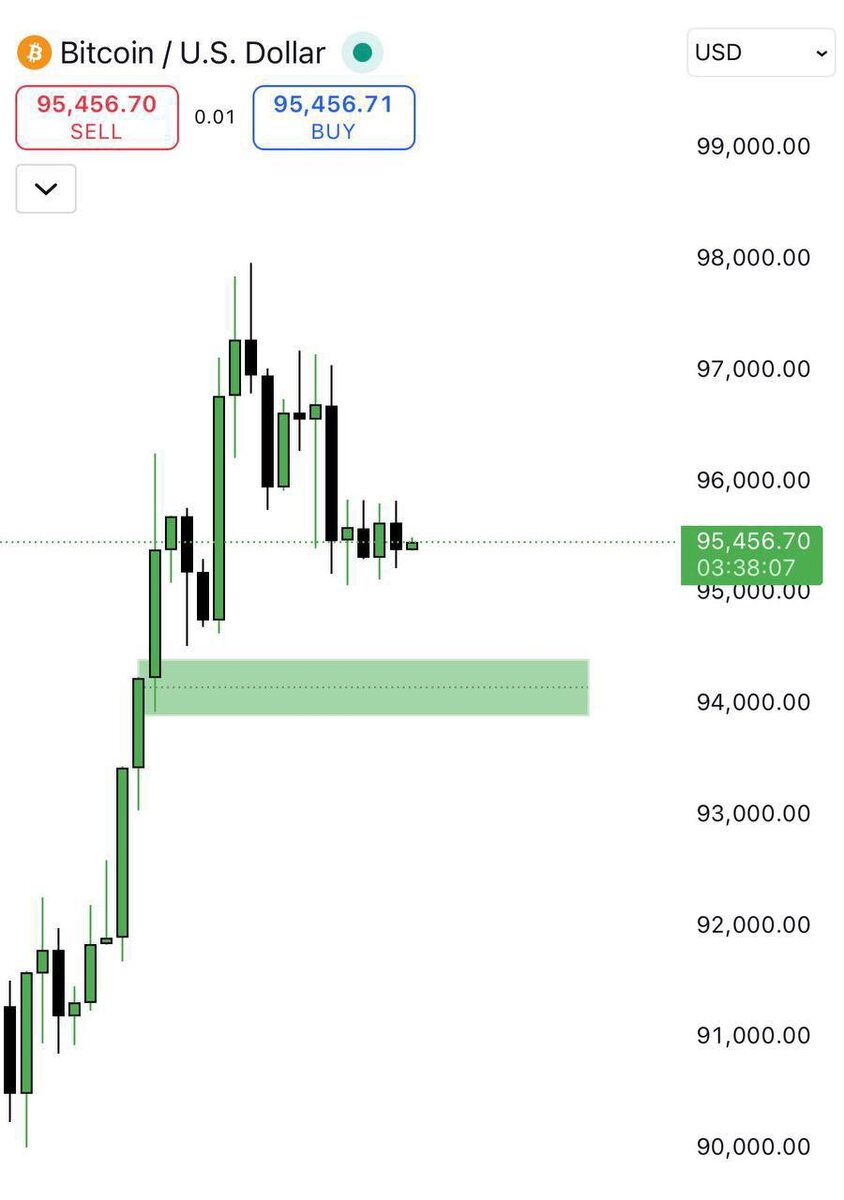 ) 🟢 Текущее состояние: Цена вышла на $95k, идёт пассивная проторговка. Сценарий: Пока торгуем ниже $98k, основной сценарий — продолжение снижения. Цели: Первая цель — поддержка $94k (наблюдаем за реакцией). Её пробой открывает путь к $90k. #BTC #Анализ #альтсезон BusineesEconomyBlockchain l Bybit