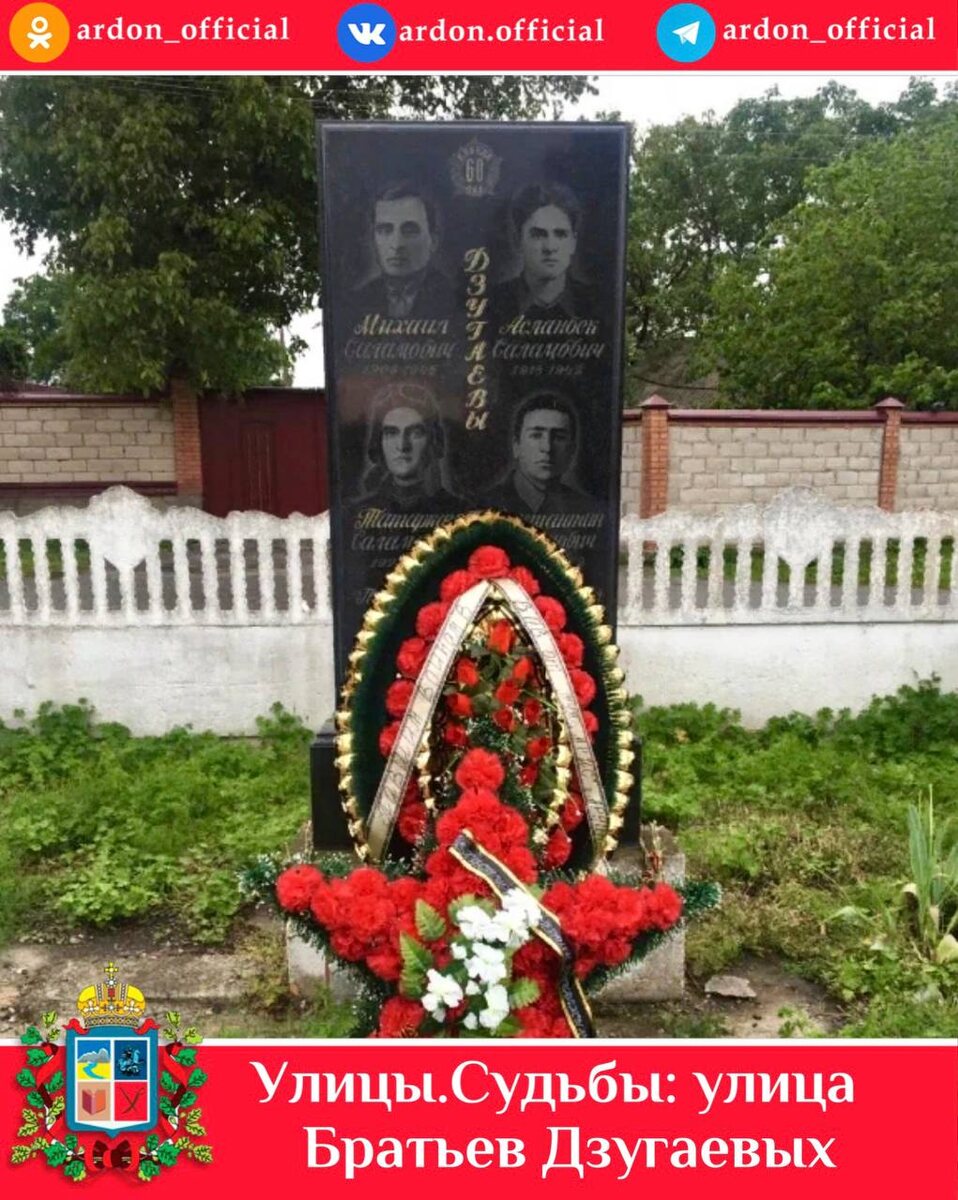 ». 📍Улица Братьев Дзугаевых Вечный огонь, который горит у монумента в память погибших в Великой Отечественной войне в центре Ардона - это дань памяти нашим землякам, не вернувшимся с полей сражений. Дороги жизни, пройденные четырьмя братьями Дзугаевыми, недолги, но они оставили после себя большой и добрый след. Братья стали комсомольцами, добросовестно трудились в сельском хозяйстве. Когда собиралась вся большая семья в родительском доме, родители радовались и гордились успехам сыновей и верили, что у детей впереди будет светлое будущее. Но началась Великая Отечественная война. Асланбек и его младший брат Татаркан первыми ушли на фронт, на второй день войны ушел добровольцем старший Михаил. Вслед за старшими братьями покинул родной очаг и Константин. Беспощадно громили врагов на фронтах войны братья Дзугаевы и в своих письмах к родителям обещали вернуться домой с победой. В одном из боёв капитан, комиссар батальона Михаил Дзугаев уничтожил трёх немецких офицеров и десять солдат,