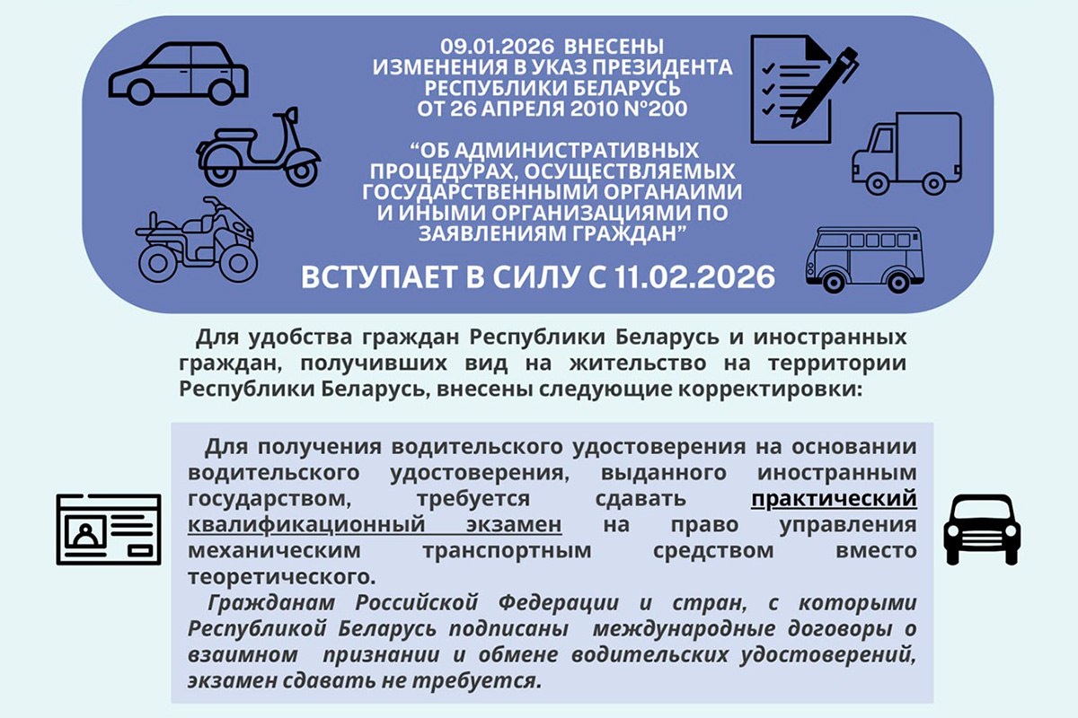 С 11 февраля 2026 года при обмене иностранных водительских удостоверений нужно будет сдавать практический экзамен по вождению, а не теорию 🛣✍️ Исключение сделано для граждан России и стран, с которыми у Беларуси есть соглашения о взаимном признании прав: для них экзамены не требуются. Читать подробнее