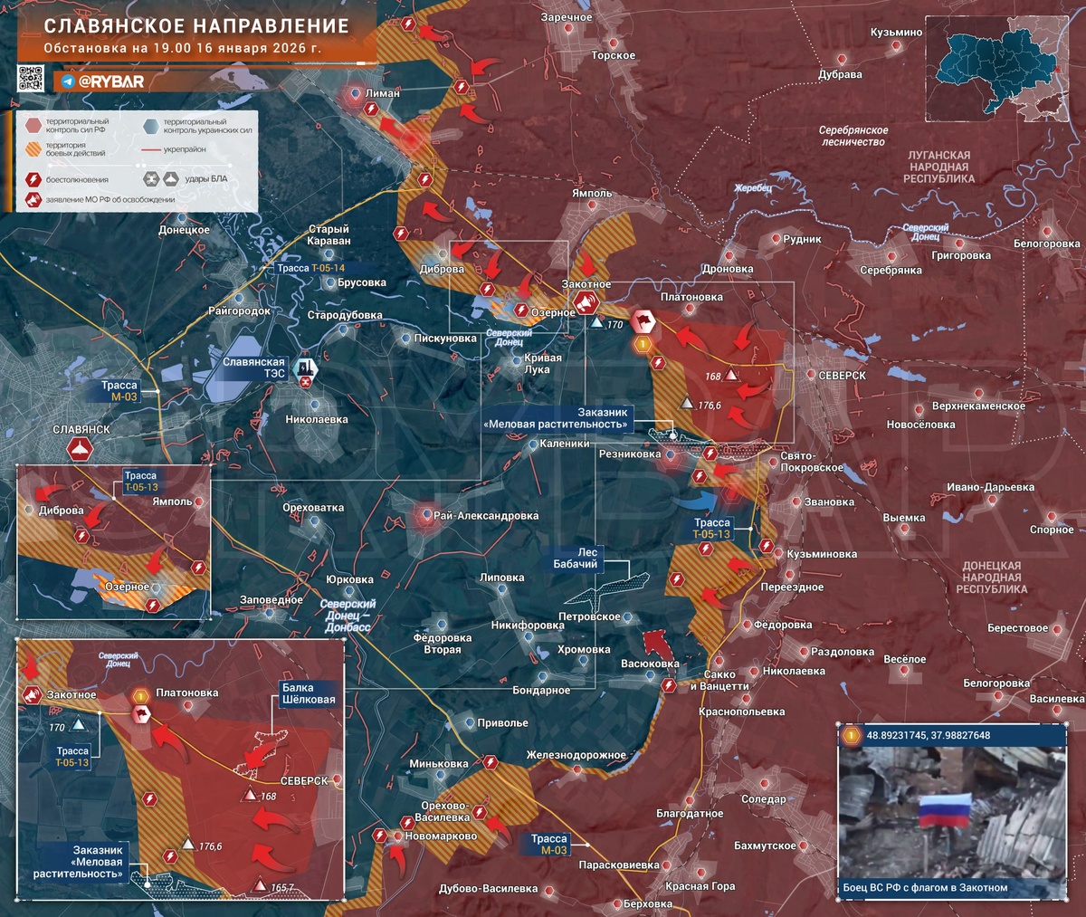 На Славянском направлении продолжается наступление российских войск, и к западу от Северска есть заметные успехи. Подразделения ВС РФ ведут бои за несколько населенных пунктов и развивают успех на высотах южнее Северского Донца. 🔻Где удалось продвинуться? 🔸В Минобороны России объявили об освобождении населенного пункта Закотное. В его восточной части развернут флаг, но есть и сообщения о продолжающихся боях. На территории соседнего Озерного продолжаются столкновения. 🔸За минувшие несколько недель российские штурмовые подразделения значительно расширили зону контроля на рубеже Платоновка — Северск, продвинувшись на высотах западнее города. 🔸Продолжаются бои за Свято-Покровское, куда противник смог заскочить из полей с юга на бронетехнике. Несмотря на поражение «брони», украинские формирования подтягивают подкрепления и укрываются в подвалах, где их, впрочем, закидывают минами. 📌 Несмотря на активные контратаки ВСУ, динамика на всем направлении остается в целом положительной. Россий