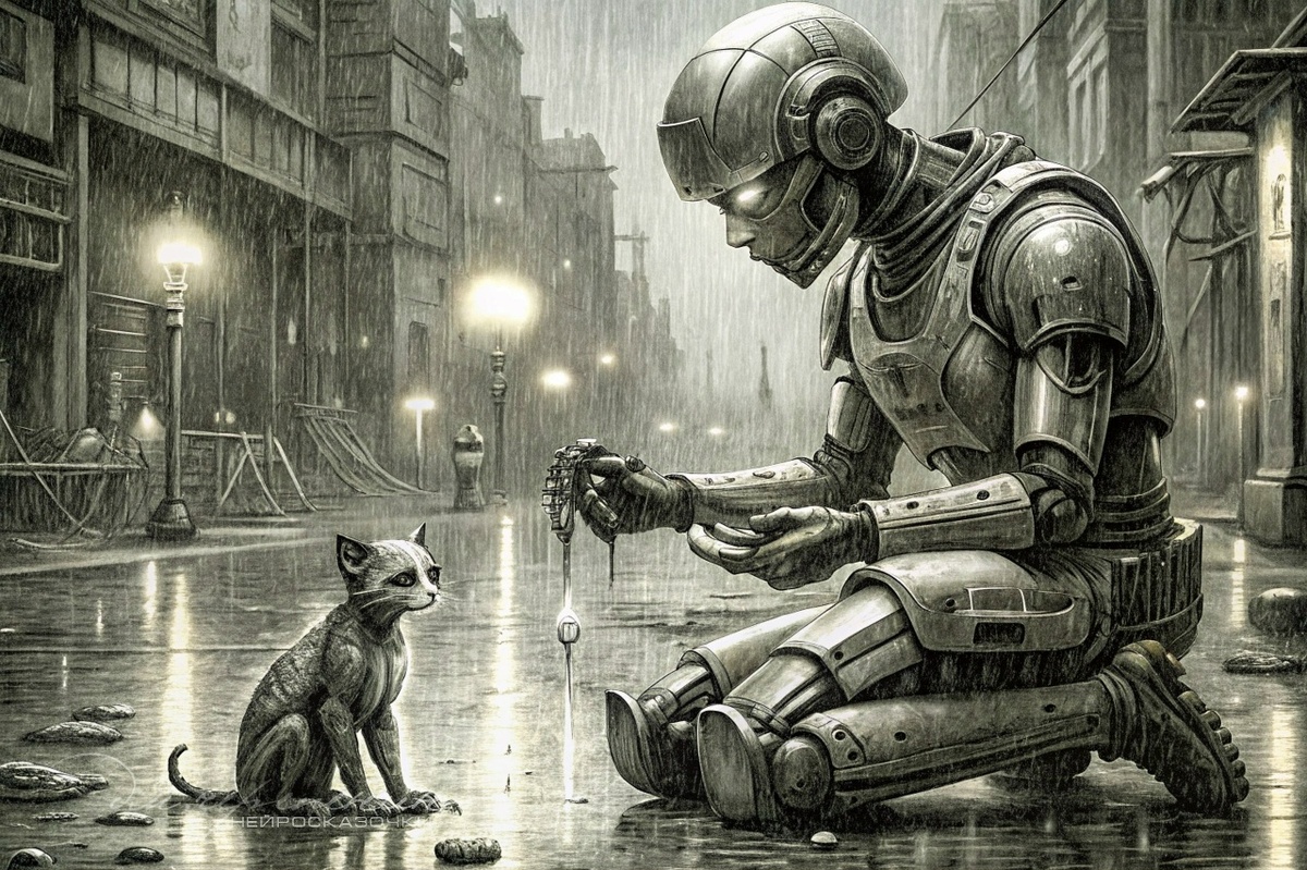 Дождливый вечер, и я – Scrap, пожалуй, самый ржавый и унылый робот- наблюдатель во всём Мегаполисе. Мой процессор анализировал капли воды на бетоне под ногами: 72% H2O, 28% городской грязи и тоски. Миссия «Наблюдать за скамейкой в парке» казалась вершиной бессмысленности. Внезапно мой аудиосенсор уловил всхлип. Из-под соседней скамейки выполз мокрый, облезлый котёнок, больше похожий на грязный помпон с глазами. Он тыкался мордой в пустую консервную банку. «Анализ: Felis catus. Уровень бедствия: критический. Вероятность получения порции топлива за помощь: 0%», – прошипел мой внутренний сенсор. Но что-то в моих схемах щёлкнуло. Я протянул руку и аккуратно раздавил банку, извлекая последние крошки еды. Котёнок, забыв про страх, вцепился в еду. А потом забрался ко мне на колени, мурлыча так, что моя ржавая обшивка вибрировала. Это… приятное ощущение. И тут случился глюк. От вибрации мой спящий режим выдачи фактов активировался. Громко и чётко я провозгласил в тишину парка: «ФАКТ: СРЕДНЯЯ Т