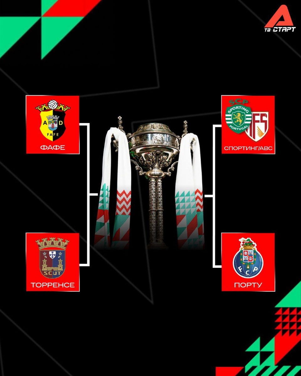! Так решил жребий. По одну сторону сетки оказались «Фафе» (третья лига) и «Торренсе» из Сегунды. По другую «Порту» сразится со «Спортингом», если, конечно, «львы» в начале февраля пройдут АВС. Смотрите Кубок Португалии на телеканалах «Старт» и платформе TVSTART.RU 🖥 Подписывайся на ТВ СТАРТ в MAX📲