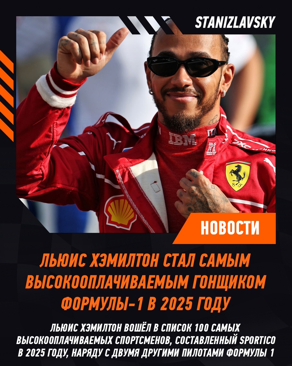 🏁 Хэмилтон является самым высокооплачиваемым гонщиком Формулы-1. По данным Sportico, его общий заработок в 2025 году составил 100 миллионов долларов — 70 миллионов из них пришлись на зарплату и призовые, ещё 30 миллионов — на рекламные контракты.