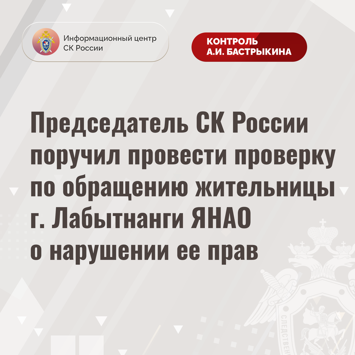 Председатель СК России поручил провести проверку по обращению жительницы г. Лабытнанги Ямало-Ненецкого автономного округа о нарушении ее прав К Председателю СК России А.И. Бастрыкину через Информационный центр обратилась жительница города Лабытнанги Ямало-Ненецкого автономного округа, являющаяся представителем коренных малочисленных народов Севера, по вопросу нарушения ее прав. С 2005 года женщина состоит на учете лиц, нуждающихся в улучшении жилищных условий, однако мер к реализации ее прав длительное время не принимается. В связи с этим заявительница вынуждена проживать в малогабаритной квартире. Многочисленные обращения в различные инстанции результатов не принесли. Председатель Следственного комитета Российской Федерации Александр Иванович Бастрыкин поручил и.о. руководителя СУ СК России по Ямало-Ненецкому автономному округу Дмитрию Ивановичу Цымбаленко провести процессуальную проверку и представить доклад о ее промежуточных результатах и принятом по итогам решении. Исполнение пор