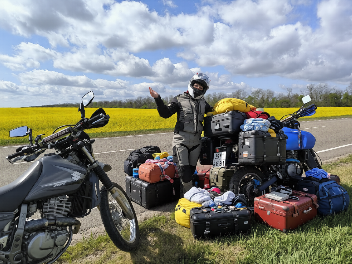 Недавно в комментариях к фотографиям одной мотоциклистки я прочла : "Да что там возить в ДВУХ КОФРАХ? " . Зашла на страницу к комментатору : мотоцикл без багажной системы , на всех фото из перевозимого добра- только маленький рюкзачок за плечами. До этого смотрела видео, где один мотоциклист показывал все, что он возит в кофрах . Кроме очевидного, мне запомнился зонт и огромный удлинитель. Так же вспомнился молоток, который муж мой в инструментах провозил три недели .И почти в конце поездки попалось плохое место для лагеря: поле такой спекшейся от жары земли, что колышки от палатки не воткнуть. А из тяжелого на километры вокруг только мой характер. Пригодился молоточек ! 👍 В общем я призадумалась ... В одну из первых наших поездок мы ехали к маме в гости (300 км от нас )с тремя почти полными кофрами на Варадеро .И повстречались на М4 с "мотобратом" , который ехал на Крым из Москвы с одной барсеткой, наглядно демонстрируя житейскую истину: "бери или вещи, или Mastercard". Я была пор