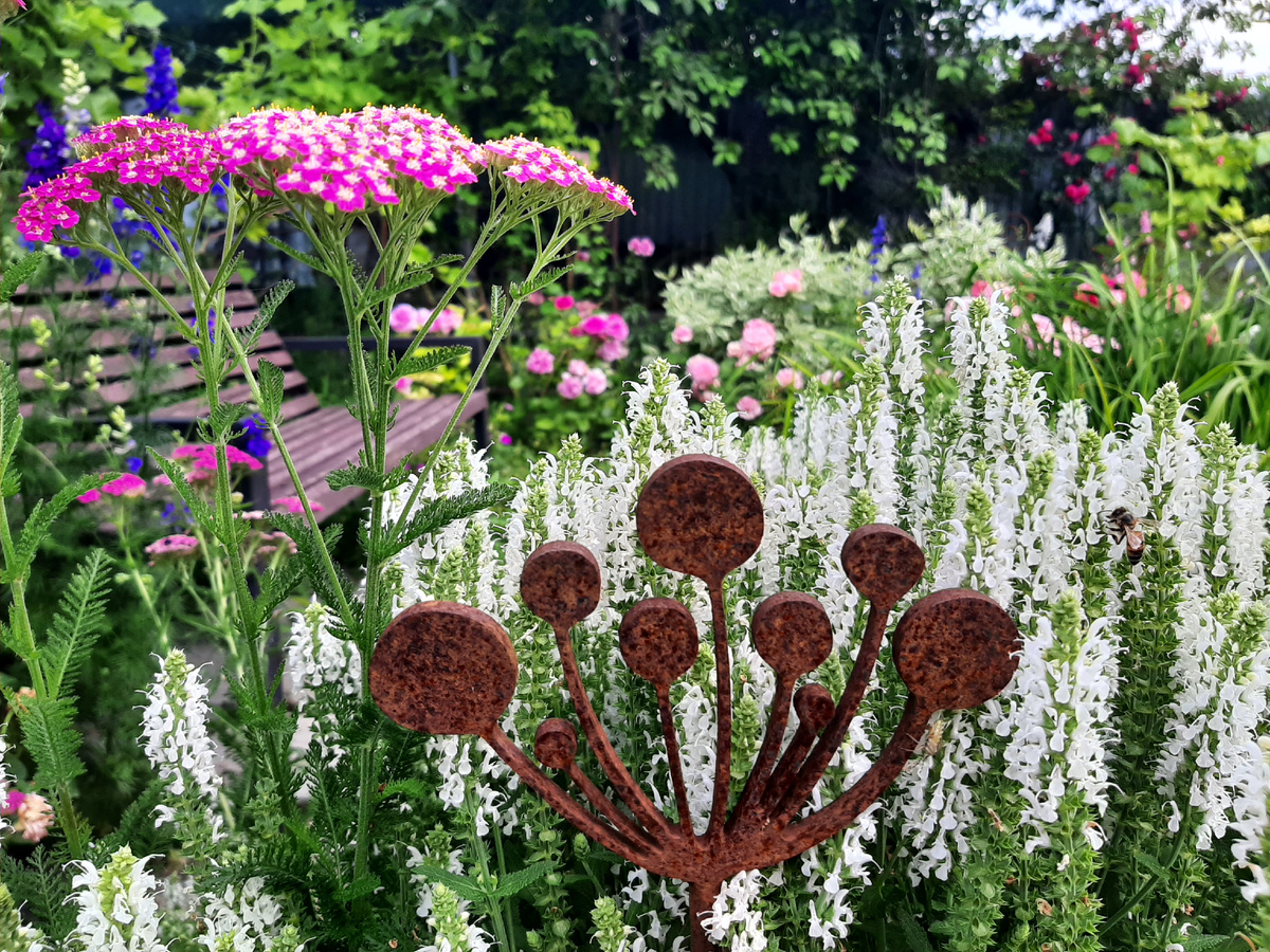 Тут, уже мысли о практичности «покинули мой чат», я хотела что-то памятное и красивое, а когда написала статью о садовом декоре зимой, решение пришло само собой. Я хочу металлический ржавый декор, но с одним нюансом, он должен быть способен и функцию опор выполнять, а для этого металлический прут, на котором держится вся красота обязана быть минимум 8мм в диаметре.