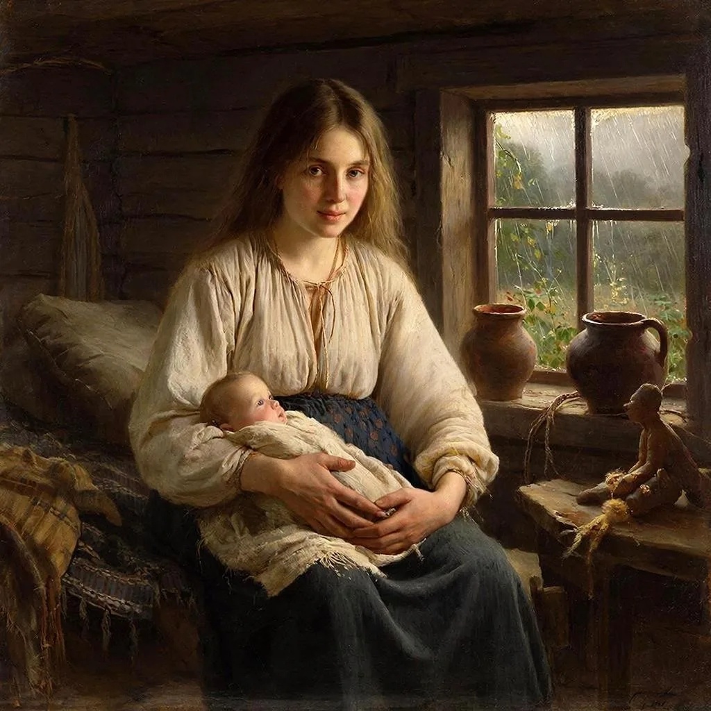 Очнулась она в избе. Там пахло свежими травами, вкусной едой. Ноги гудели, тело ломило от усталости, но поняв что рядом нет ребенка девушка вскочила, и бросилась к выходу. Но не успев добежать , двери распахнулись и в горницу вошёл старец держа на руках свёрток .