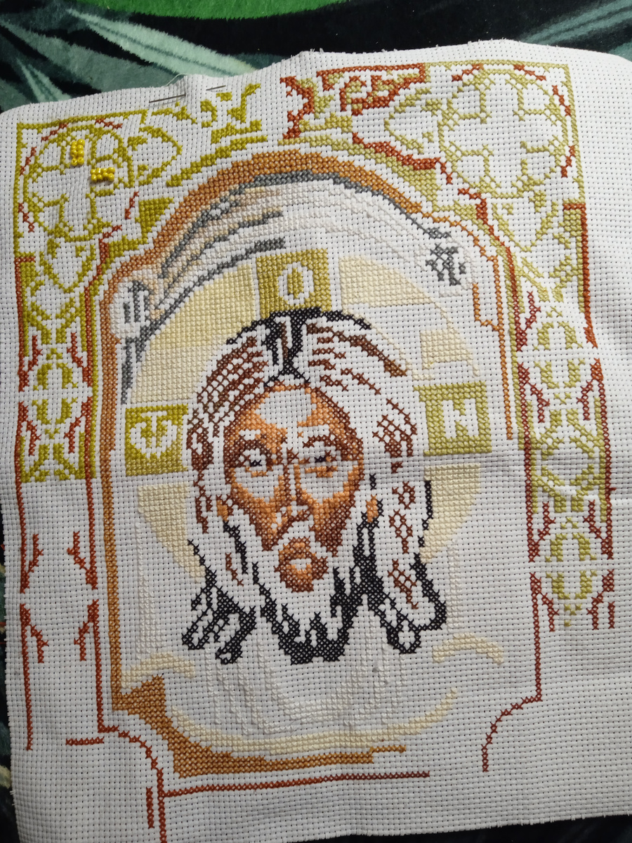 В последний месяц я вышивала очень много. Кроме того, я начала еще одну новую работу. И уже почти закончила ее. Это икона "Нерукотворный спас" по схеме из книги. Смешанный стиль, вышивается и бисером, и крестом. Вот кстати как это выглядит на
