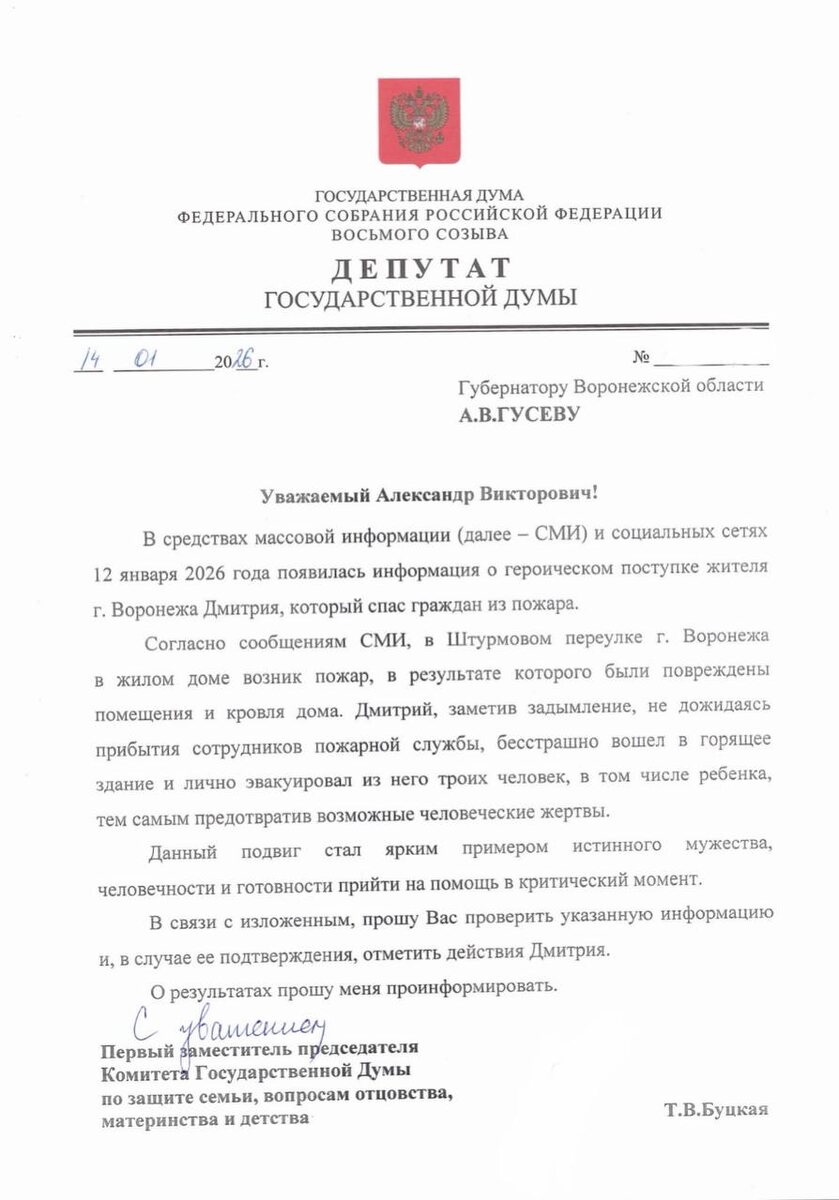 ! Недавно в СМИ появились новости о том, что житель Воронежа Дмитрий спас троих людей из сильного пожара. 🗞 Сообщается, что Дмитрий, заметив задымление, не дожидаясь прибытия сотрудников пожарной службы, бесстрашно вошел в горящее здание. Он успешно эвакуировал троих человек, в том числе ребенка. Благодаря его решительному поступку удалось избежать трагедии. 📨 Уверена, что поступок достоин награды! Поэтому написала обращение на имя губернатора Александра Гусева с соответствующим предложением. Поступок Дмитрия стал ярким примером мужества, человечности и готовности прийти на помощь 💪 #Депутат_Буцкая