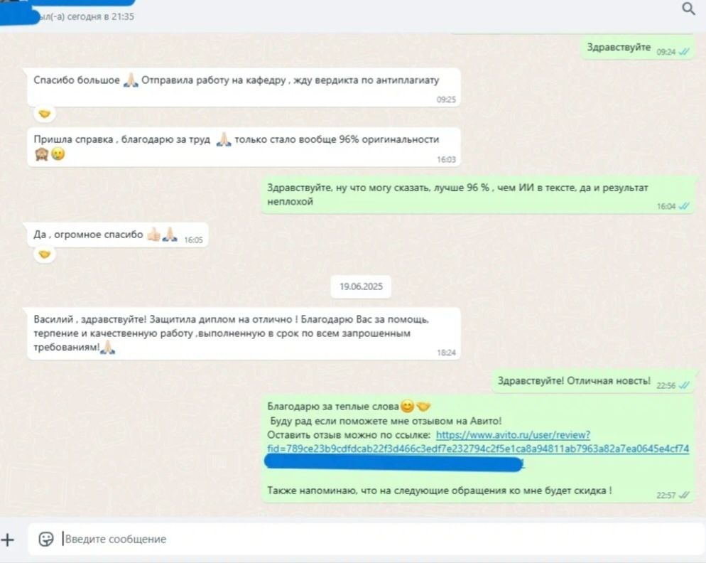 Студентка приносит дипломную работу от другого исполнителя. Ну, как работу. Откровенную халтуру, кишащую метками ИИ. "Антиплагиат" уложил эту "красоту" на лопатки без шансов. Всё по классике: времени нет, оригинальность на дне, в тексте бардак, работы - тьма. Я иногда поражаюсь тому, как халтурят некоторые мои "коллеги". Вы бы знали, как часто мне приносят чужое творчество на исправление. А там не то, что исправлять - там пиши заново, потому что это не работа, а провал. Работу я исправил (=переписал полностью ) и вывел на достойный уровень. Убрал все следы ИИ, подобрал нормальную научную литературу, провёл свой анализ - словом, сделал всё, что предыдущий "автор" счёл лишним. Клиентка защитилась на отлично. Друзья! Пожалуйста, будьте внимательны при выборе исполнителя! Не рискуйте своим образованием, деньгами и временем. Проконсультироваться со мной можно в вк НАПИСАТЬ МНЕ В ВК или написать в Telegram @volgapkinStud МОЙ КАНАЛ В TELEGRAM СООБЩЕСТВО В ВК ОТЗЫВЫ О МОЕЙ РАБОТЕ