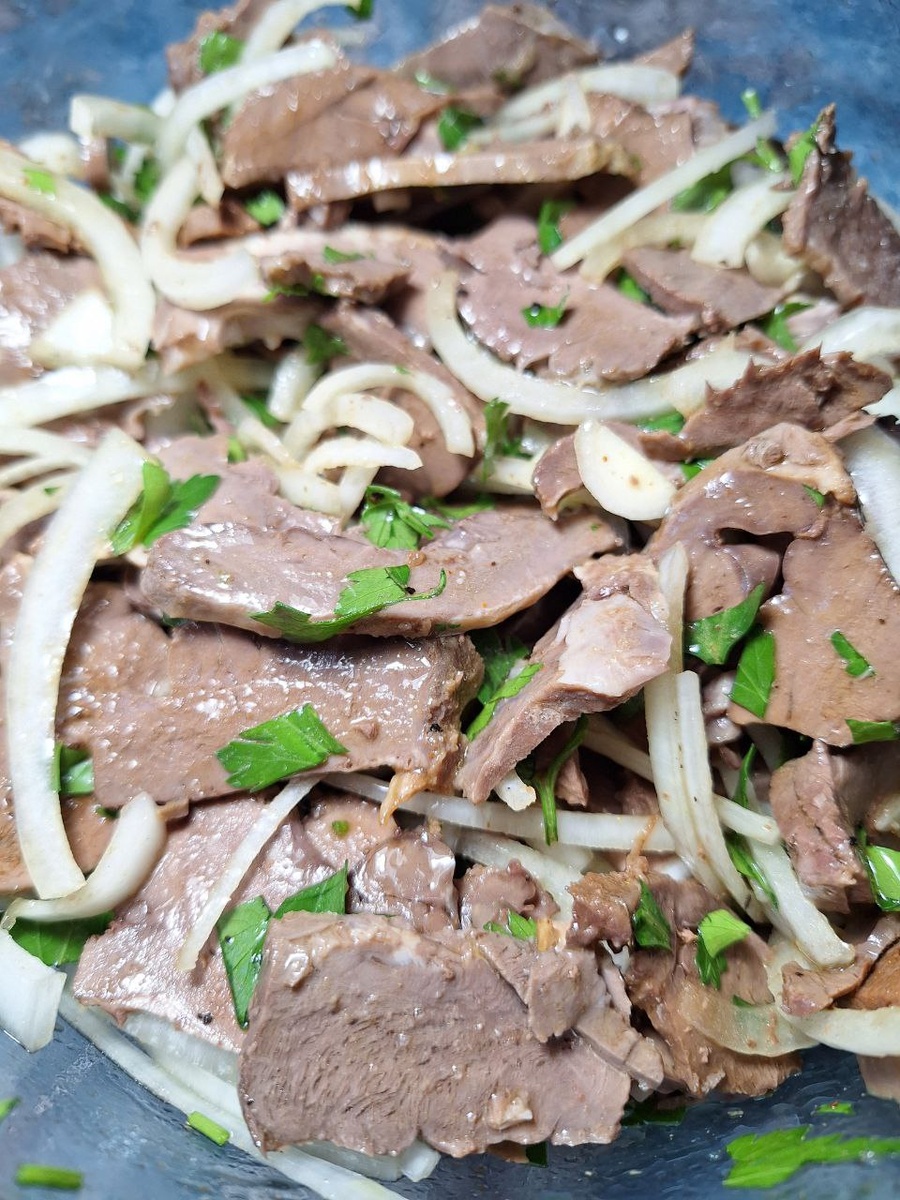 Готовое сердце достаем из бульона и даем остыть. Затем нарезаем тонкими слайсами, лук нарезаем тонкими полукольцами, петрушку мелко нарезаем и соединяем с сердцем. Добавляем соль, сахар, перец, уксус, соевый соус, раст. масло - все перемешать и оставить для маринования на 30 минут. Приятного аппетита!