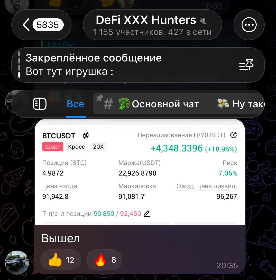 » ❌ И не угадайка Это обычная рабочая сделка из чата DeFi XXX Hunters. BTC. Шорт. 20x. Чёткий вход - чёткий выход. Без истерик. Без догонок. Без казино. 📈 +4 348 USDT 📊 Почти +19% к депозиту 🧠 Риск под контролем 🚪 Вышел по плану, а не по эмоциям В чате Хантеров: — разбираем входы до движения — показываем, где выходить, а не «держи до луны» — учим думать как трейдер, а не как зритель — сделки, логика, опыт — каждый день ⚡️ Важно: Сейчас действуют СКИДКИ на вход в Хантеров. Такой цены потом не будет. Если ты устал: — заходить поздно — закрываться в минусе — смотреть, как цена идёт без тебя 👉 Тебе в ХАНТЕРЫ особенно сейчас.